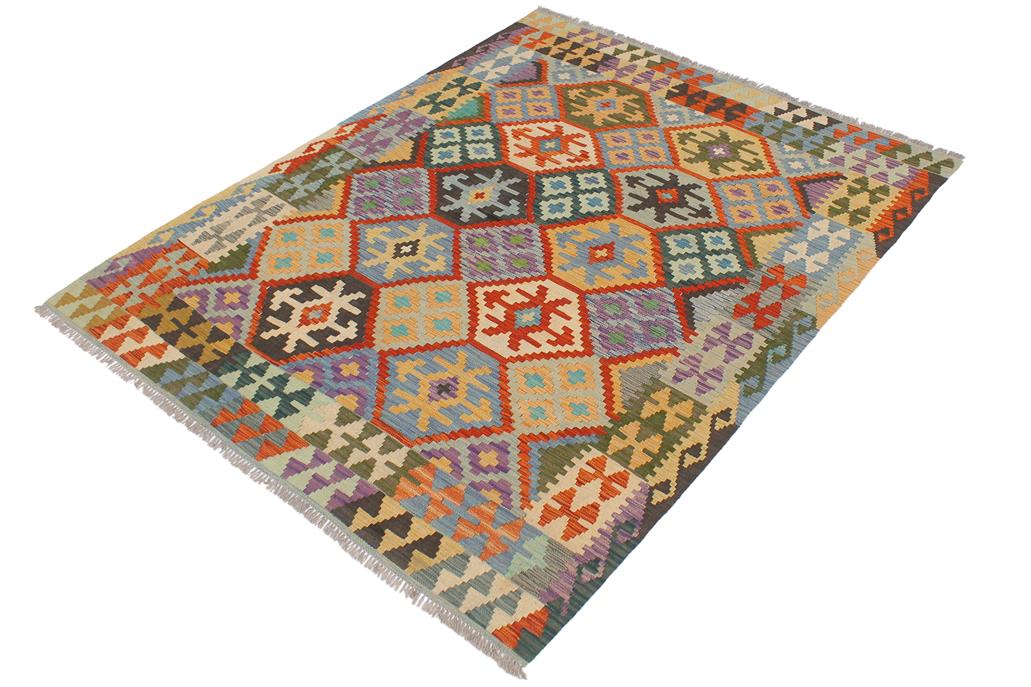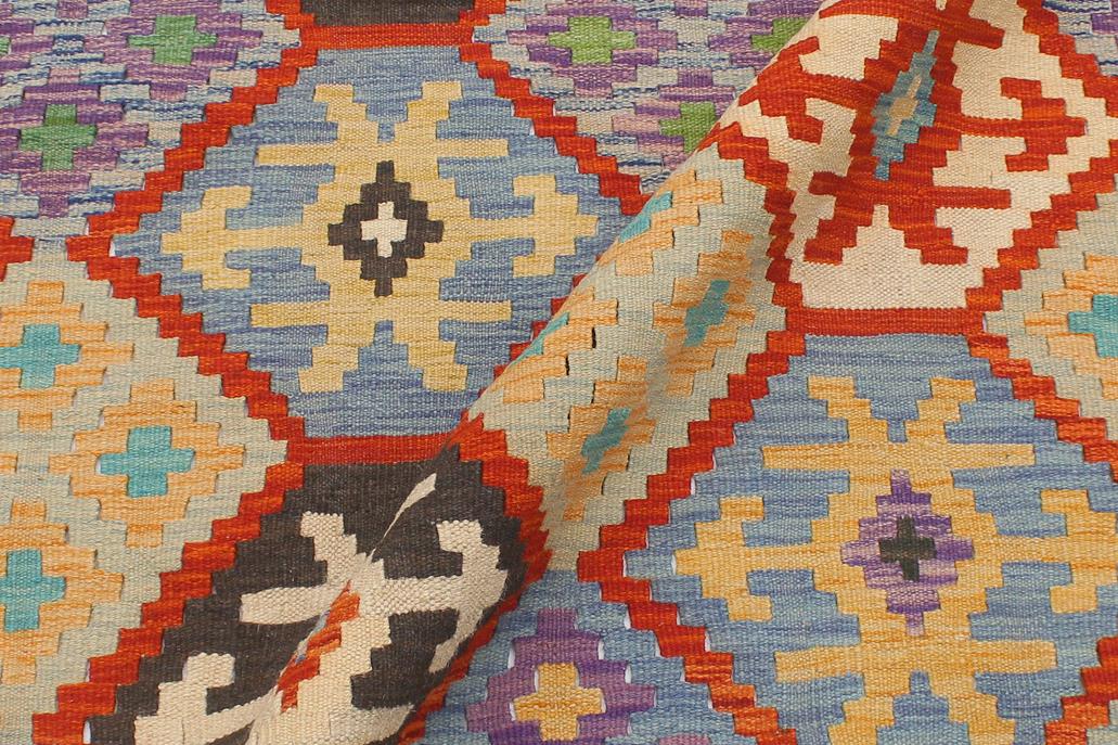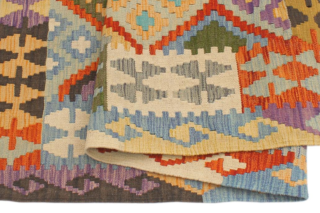 Elevate the elegance of your home with this stunning hand-woven tribal Kilim wool rug. Meticulously crafted on a loom by the Nomad Turkman people using hand-spun wool and 100% natural vegetable dyes, these rugs are recognized for their repetitive geometric patterns, incorporating naturalistic floral and traditional designs. The contemporary fashion palette results in bold, sharp patterns that are incredibly versatile, as the pattern is the same on both sides. These reversible rugs feature a lighter shade on one side and brighter colors on the other, providing versatility according to preference. These unique rugs are made by knotting short strands of different colors onto the warps and securing them by tightly pressing the wefts. The designs are created by interweaving the various colored wefts and warps. Kilims are known for their exceptional durability and versatility, making them truly unique rugs.