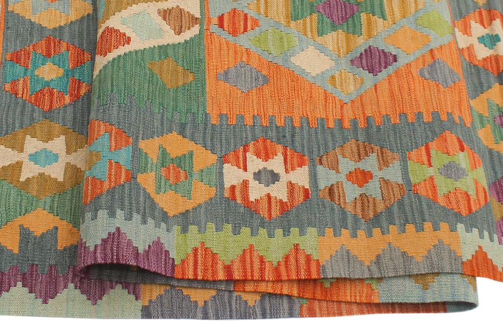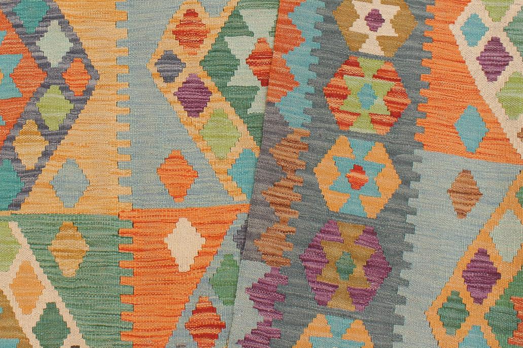 Elevate the elegance of your home with this stunning hand-woven tribal Kilim wool rug. Meticulously crafted on a loom by the Nomad Turkman people using hand-spun wool and 100% natural vegetable dyes, these rugs are recognized for their repetitive geometric patterns, incorporating naturalistic floral and traditional designs. The contemporary fashion palette results in bold, sharp patterns that are incredibly versatile, as the pattern is the same on both sides. These reversible rugs feature a lighter shade on one side and brighter colors on the other, providing versatility according to preference. These unique rugs are made by knotting short strands of different colors onto the warps and securing them by tightly pressing the wefts. The designs are created by interweaving the various colored wefts and warps. Kilims are known for their exceptional durability and versatility, making them truly unique rugs.