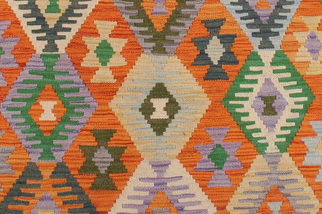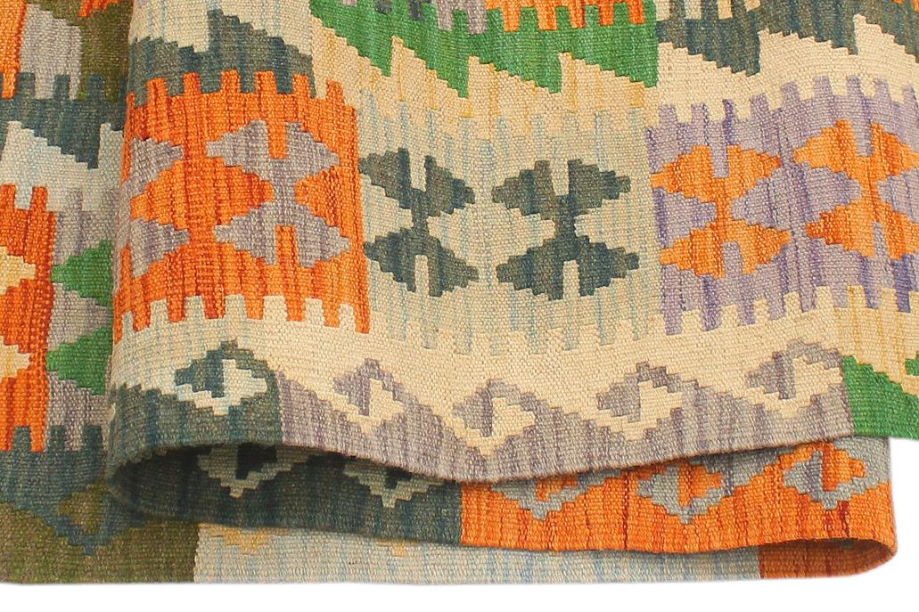 Elevate the elegance of your home with this stunning hand-woven tribal Kilim wool rug. Meticulously crafted on a loom by the Nomad Turkman people using hand-spun wool and 100% natural vegetable dyes, these rugs are recognized for their repetitive geometric patterns, incorporating naturalistic floral and traditional designs. The contemporary fashion palette results in bold, sharp patterns that are incredibly versatile, as the pattern is the same on both sides. These reversible rugs feature a lighter shade on one side and brighter colors on the other, providing versatility according to preference. These unique rugs are made by knotting short strands of different colors onto the warps and securing them by tightly pressing the wefts. The designs are created by interweaving the various colored wefts and warps. Kilims are known for their exceptional durability and versatility, making them truly unique rugs.