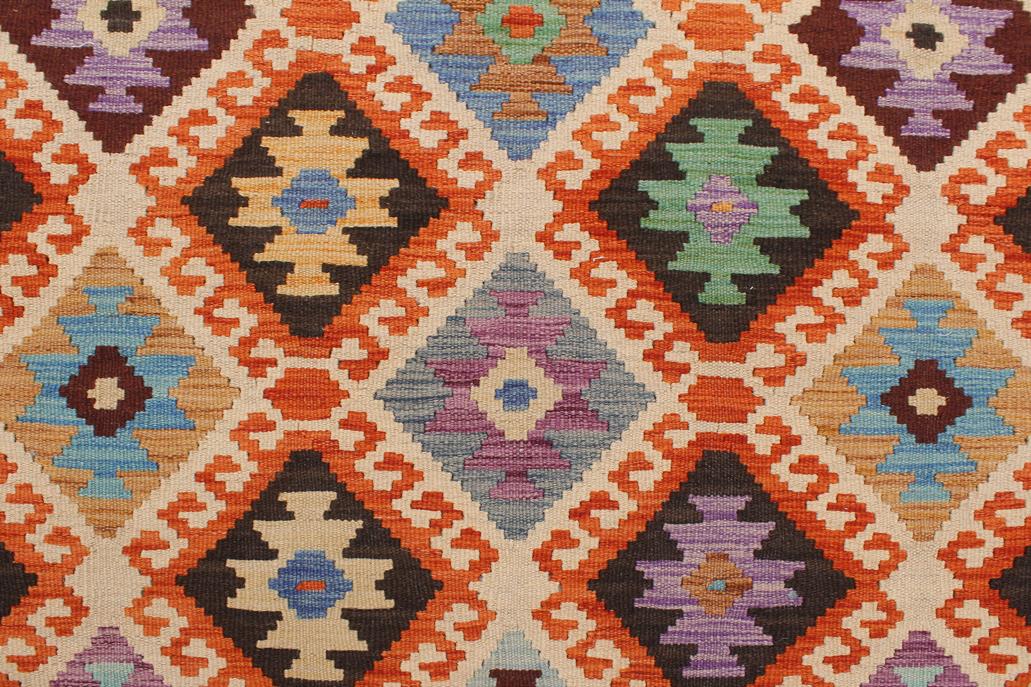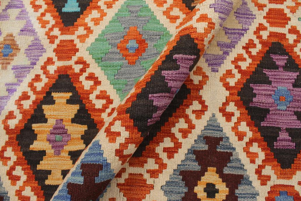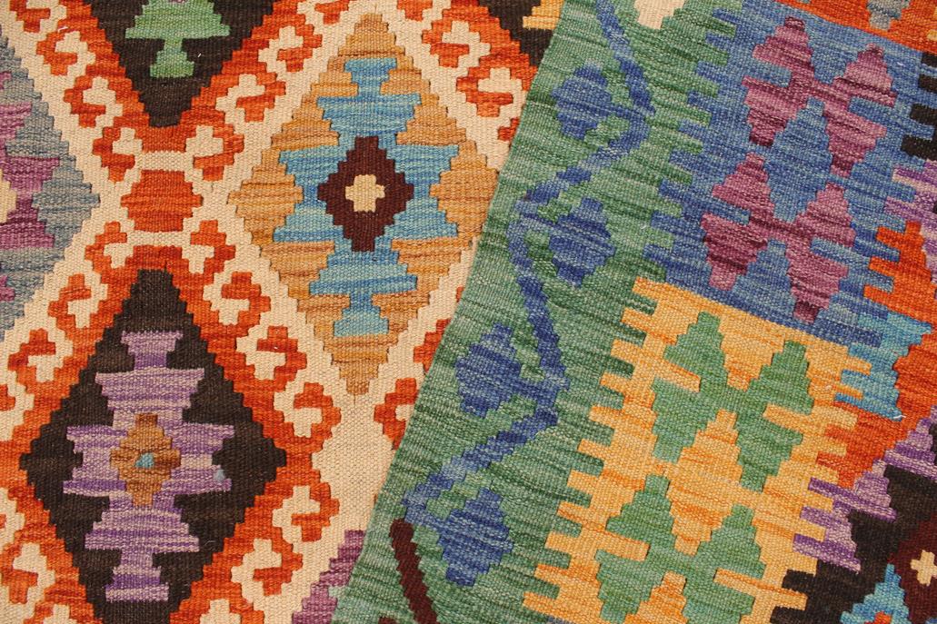 Elevate the elegance of your home with this stunning hand-woven tribal Kilim wool rug. Meticulously crafted on a loom by the Nomad Turkman people using hand-spun wool and 100% natural vegetable dyes, these rugs are recognized for their repetitive geometric patterns, incorporating naturalistic floral and traditional designs. The contemporary fashion palette results in bold, sharp patterns that are incredibly versatile, as the pattern is the same on both sides. These reversible rugs feature a lighter shade on one side and brighter colors on the other, providing versatility according to preference. These unique rugs are made by knotting short strands of different colors onto the warps and securing them by tightly pressing the wefts. The designs are created by interweaving the various colored wefts and warps. Kilims are known for their exceptional durability and versatility, making them truly unique rugs.