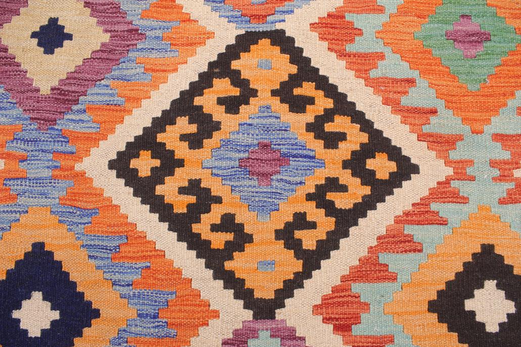 Elevate the elegance of your home with this stunning hand-woven tribal Kilim wool rug. Meticulously crafted on a loom by the Nomad Turkman people using hand-spun wool and 100% natural vegetable dyes, these rugs are recognized for their repetitive geometric patterns, incorporating naturalistic floral and traditional designs. The contemporary fashion palette results in bold, sharp patterns that are incredibly versatile, as the pattern is the same on both sides. These reversible rugs feature a lighter shade on one side and brighter colors on the other, providing versatility according to preference. These unique rugs are made by knotting short strands of different colors onto the warps and securing them by tightly pressing the wefts. The designs are created by interweaving the various colored wefts and warps. Kilims are known for their exceptional durability and versatility, making them truly unique rugs.