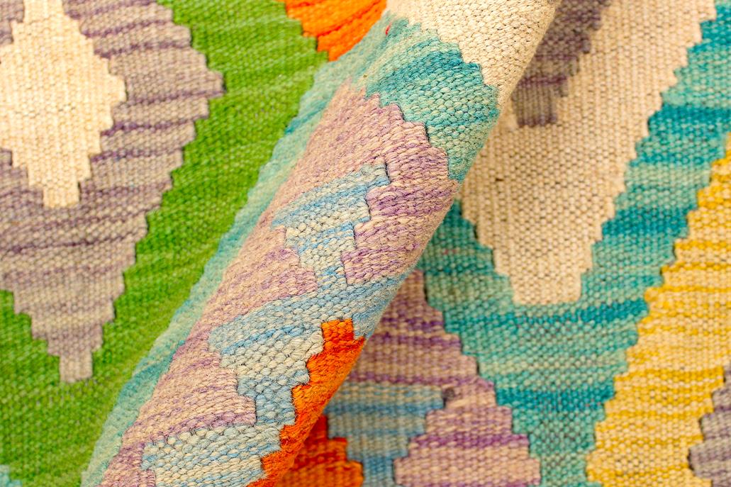 Elevate the elegance of your home with this stunning hand-woven tribal Kilim wool rug. Meticulously crafted on a loom by the Nomad Turkman people using hand-spun wool and 100% natural vegetable dyes, these rugs are recognized for their repetitive geometric patterns, incorporating naturalistic floral and traditional designs. The contemporary fashion palette results in bold, sharp patterns that are incredibly versatile, as the pattern is the same on both sides. These reversible rugs feature a lighter shade on one side and brighter colors on the other, providing versatility according to preference. These unique rugs are made by knotting short strands of different colors onto the warps and securing them by tightly pressing the wefts. The designs are created by interweaving the various colored wefts and warps. Kilims are known for their exceptional durability and versatility, making them truly unique rugs.