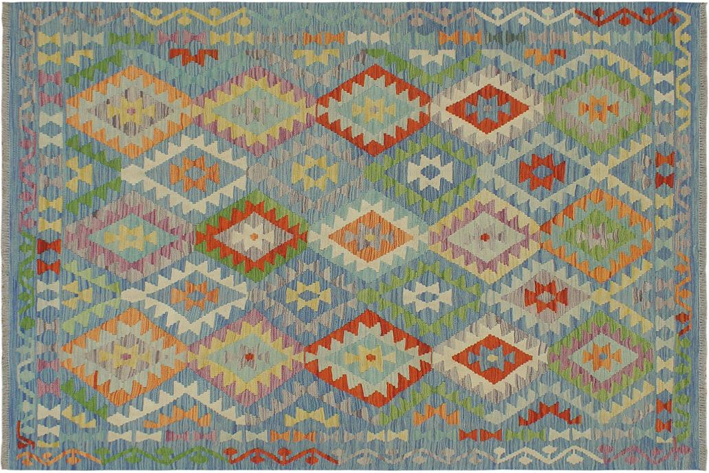 Elevate the elegance of your home with this stunning hand-woven tribal Kilim wool rug. Meticulously crafted on a loom by the Nomad Turkman people using hand-spun wool and 100% natural vegetable dyes, these rugs are recognized for their repetitive geometric patterns, incorporating naturalistic floral and traditional designs. The contemporary fashion palette results in bold, sharp patterns that are incredibly versatile, as the pattern is the same on both sides. These reversible rugs feature a lighter shade on one side and brighter colors on the other, providing versatility according to preference. These unique rugs are made by knotting short strands of different colors onto the warps and securing them by tightly pressing the wefts. The designs are created by interweaving the various colored wefts and warps. Kilims are known for their exceptional durability and versatility, making them truly unique rugs.