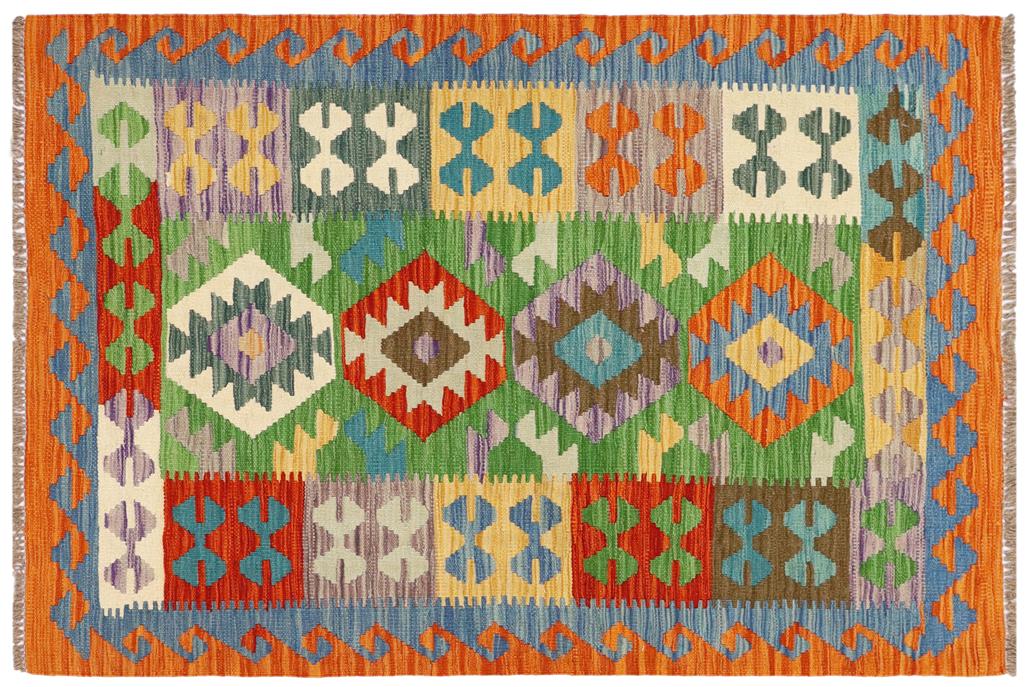 Elevate the elegance of your home with this stunning hand-woven tribal Kilim wool rug. Meticulously crafted on a loom by the Nomad Turkman people using hand-spun wool and 100% natural vegetable dyes, these rugs are recognized for their repetitive geometric patterns, incorporating naturalistic floral and traditional designs. The contemporary fashion palette results in bold, sharp patterns that are incredibly versatile, as the pattern is the same on both sides. These reversible rugs feature a lighter shade on one side and brighter colors on the other, providing versatility according to preference. These unique rugs are made by knotting short strands of different colors onto the warps and securing them by tightly pressing the wefts. The designs are created by interweaving the various colored wefts and warps. Kilims are known for their exceptional durability and versatility, making them truly unique rugs.