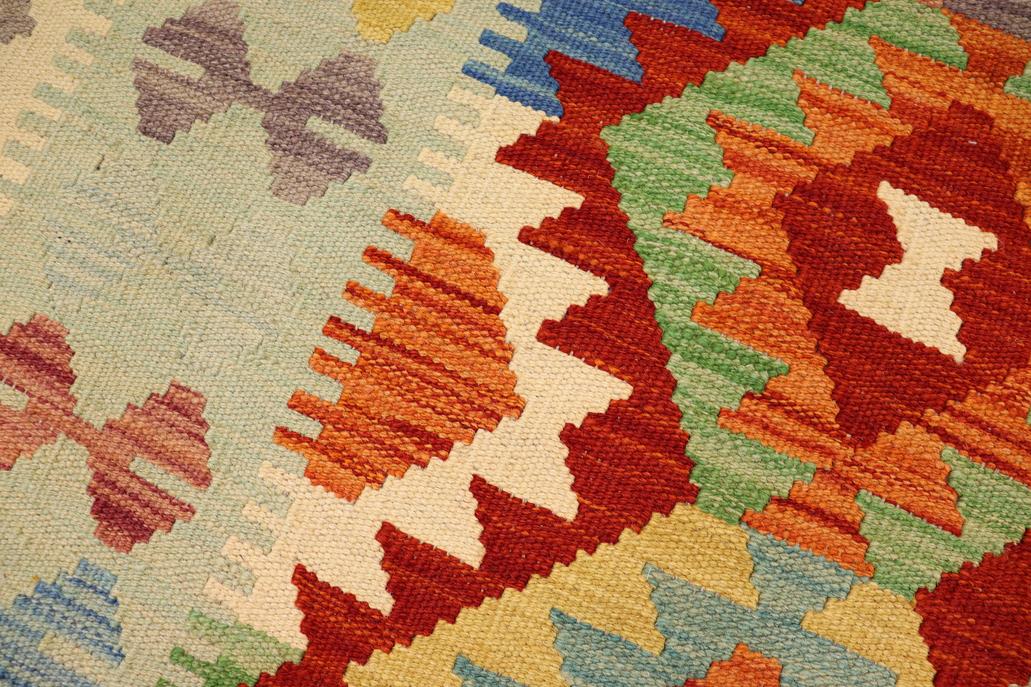 Elevate the elegance of your home with this stunning hand-woven tribal Kilim wool rug. Meticulously crafted on a loom by the Nomad Turkman people using hand-spun wool and 100% natural vegetable dyes, these rugs are recognized for their repetitive geometric patterns, incorporating naturalistic floral and traditional designs. The contemporary fashion palette results in bold, sharp patterns that are incredibly versatile, as the pattern is the same on both sides. These reversible rugs feature a lighter shade on one side and brighter colors on the other, providing versatility according to preference. These unique rugs are made by knotting short strands of different colors onto the warps and securing them by tightly pressing the wefts. The designs are created by interweaving the various colored wefts and warps. Kilims are known for their exceptional durability and versatility, making them truly unique rugs.