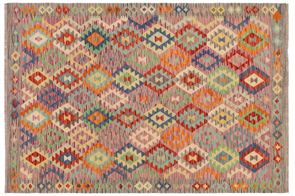 Elevate the elegance of your home with this stunning hand-woven tribal Kilim wool rug. Meticulously crafted on a loom by the Nomad Turkman people using hand-spun wool and 100% natural vegetable dyes, these rugs are recognized for their repetitive geometric patterns, incorporating naturalistic floral and traditional designs. The contemporary fashion palette results in bold, sharp patterns that are incredibly versatile, as the pattern is the same on both sides. These reversible rugs feature a lighter shade on one side and brighter colors on the other, providing versatility according to preference. These unique rugs are made by knotting short strands of different colors onto the warps and securing them by tightly pressing the wefts. The designs are created by interweaving the various colored wefts and warps. Kilims are known for their exceptional durability and versatility, making them truly unique rugs.