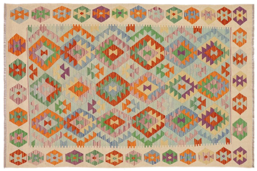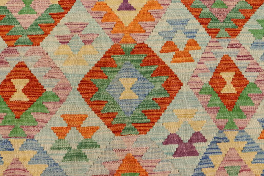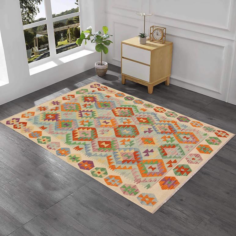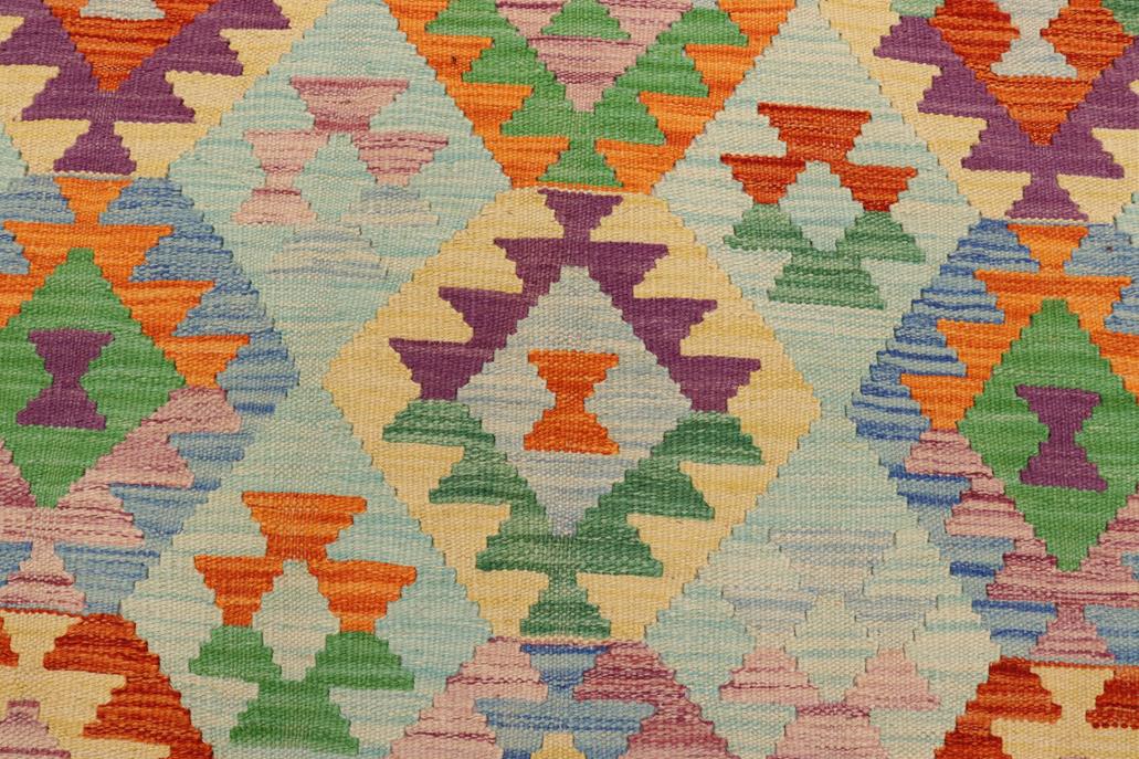 Elevate the elegance of your home with this stunning hand-woven tribal Kilim wool rug. Meticulously crafted on a loom by the Nomad Turkman people using hand-spun wool and 100% natural vegetable dyes, these rugs are recognized for their repetitive geometric patterns, incorporating naturalistic floral and traditional designs. The contemporary fashion palette results in bold, sharp patterns that are incredibly versatile, as the pattern is the same on both sides. These reversible rugs feature a lighter shade on one side and brighter colors on the other, providing versatility according to preference. These unique rugs are made by knotting short strands of different colors onto the warps and securing them by tightly pressing the wefts. The designs are created by interweaving the various colored wefts and warps. Kilims are known for their exceptional durability and versatility, making them truly unique rugs.