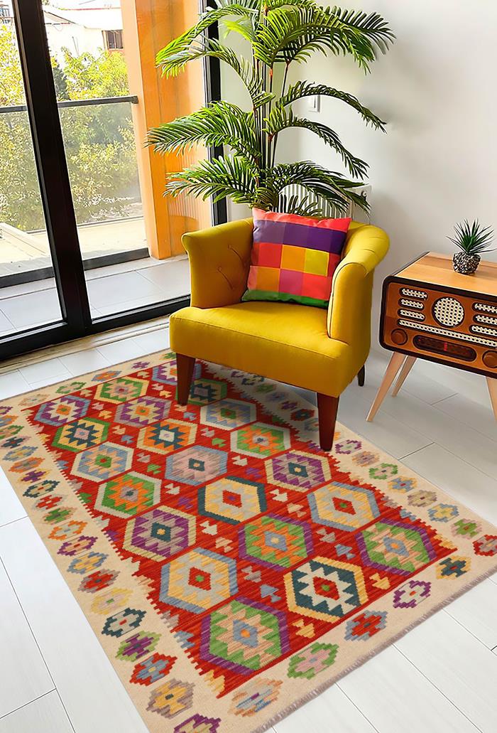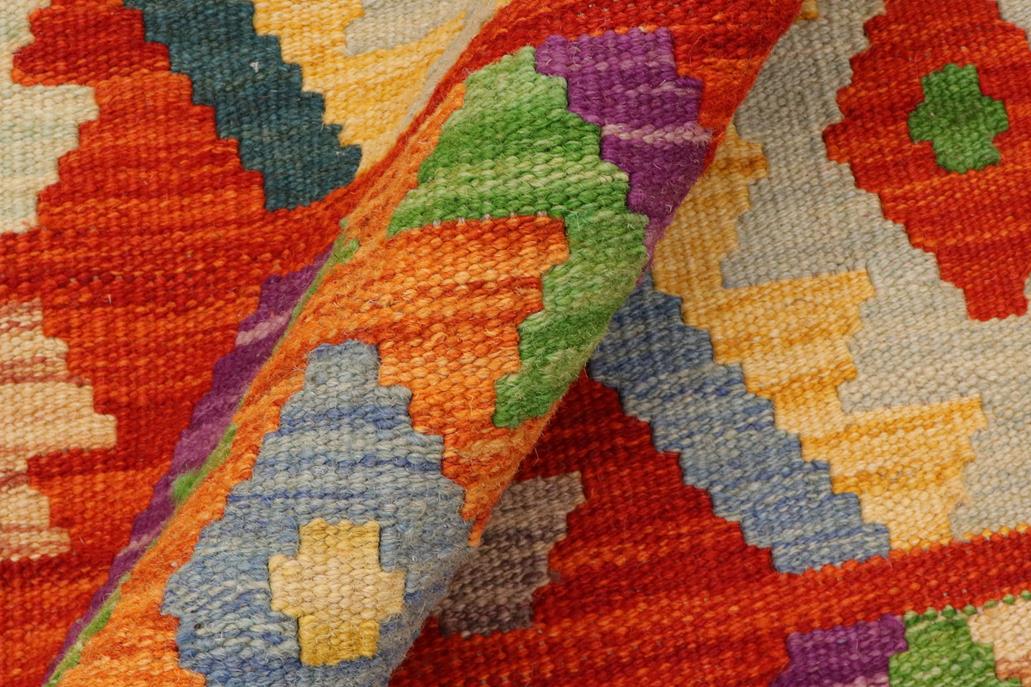 Elevate the elegance of your home with this stunning hand-woven tribal Kilim wool rug. Meticulously crafted on a loom by the Nomad Turkman people using hand-spun wool and 100% natural vegetable dyes, these rugs are recognized for their repetitive geometric patterns, incorporating naturalistic floral and traditional designs. The contemporary fashion palette results in bold, sharp patterns that are incredibly versatile, as the pattern is the same on both sides. These reversible rugs feature a lighter shade on one side and brighter colors on the other, providing versatility according to preference. These unique rugs are made by knotting short strands of different colors onto the warps and securing them by tightly pressing the wefts. The designs are created by interweaving the various colored wefts and warps. Kilims are known for their exceptional durability and versatility, making them truly unique rugs.