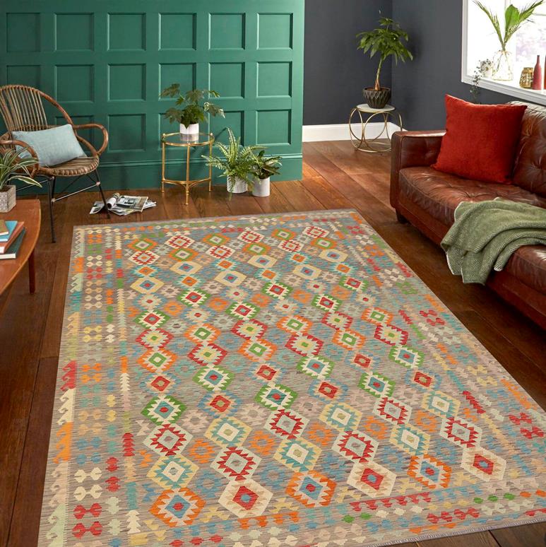 Elevate the elegance of your home with this stunning hand-woven tribal Kilim wool rug. Meticulously crafted on a loom by the Nomad Turkman people using hand-spun wool and 100% natural vegetable dyes, these rugs are recognized for their repetitive geometric patterns, incorporating naturalistic floral and traditional designs. The contemporary fashion palette results in bold, sharp patterns that are incredibly versatile, as the pattern is the same on both sides. These reversible rugs feature a lighter shade on one side and brighter colors on the other, providing versatility according to preference. These unique rugs are made by knotting short strands of different colors onto the warps and securing them by tightly pressing the wefts. The designs are created by interweaving the various colored wefts and warps. Kilims are known for their exceptional durability and versatility, making them truly unique rugs.