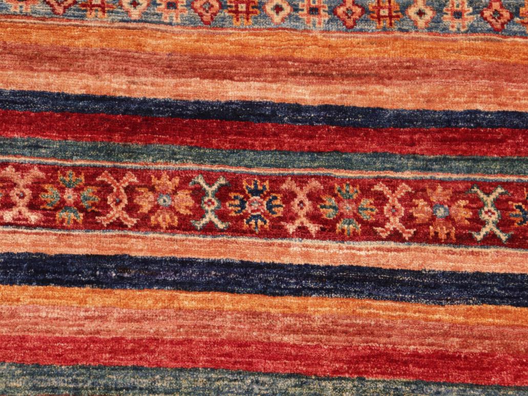 Designed with a mesmerizing intricate transitional and geometric motif this glorious hand knotted rug made with handspun Ghazni wool is a masterpiece that will fill any space with sophistication and grace. Hand knotted by skilled artisans in an exhilarating color pallet with an elaborate design, this masterpiece features luxurious hand spun wool with all vegetable dyes to add comfort and style to your decor. The design, color, and beautiful chromatic composition with a sheen in transitional and geometric designs, exude beauty, elegance and quality make this rug an extraordinarily opulent center piece for your living space. The intricate designs known as Khurgeen, Khorgeen or Khorjin range are inspired by the patterns from ancient tribal bags. An infusion of bold, saturated color gives this traditional hand-knotted rug a fresh perspective and modern appeal. Most desired due to its versatility in design and affordability this handmade rug is in a compelling focal point in any living area.