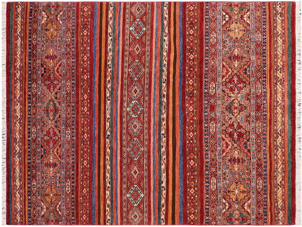 Rustic Khurgeen Helaine Red/Blue Wool Rug - 5'6'' x 7'10''