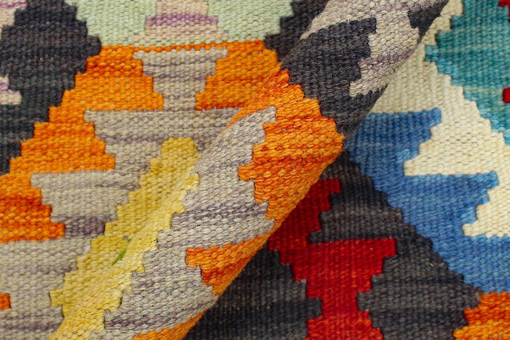 Elevate the elegance of your home with this stunning hand-woven tribal Kilim wool rug. Meticulously crafted on a loom by the Nomad Turkman people using hand-spun wool and 100% natural vegetable dyes, these rugs are recognized for their repetitive geometric patterns, incorporating naturalistic floral and traditional designs. The contemporary fashion palette results in bold, sharp patterns that are incredibly versatile, as the pattern is the same on both sides. These reversible rugs feature a lighter shade on one side and brighter colors on the other, providing versatility according to preference. These unique rugs are made by knotting short strands of different colors onto the warps and securing them by tightly pressing the wefts. The designs are created by interweaving the various colored wefts and warps. Kilims are known for their exceptional durability and versatility, making them truly unique rugs.