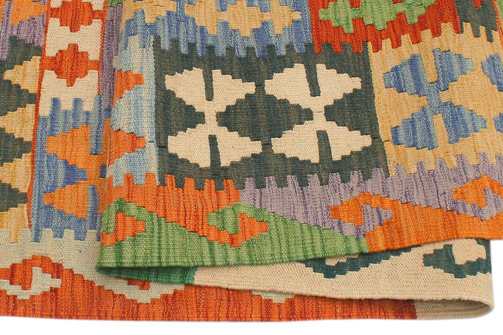 Elevate the elegance of your home with this stunning hand-woven tribal Kilim wool rug. Meticulously crafted on a loom by the Nomad Turkman people using hand-spun wool and 100% natural vegetable dyes, these rugs are recognized for their repetitive geometric patterns, incorporating naturalistic floral and traditional designs. The contemporary fashion palette results in bold, sharp patterns that are incredibly versatile, as the pattern is the same on both sides. These reversible rugs feature a lighter shade on one side and brighter colors on the other, providing versatility according to preference. These unique rugs are made by knotting short strands of different colors onto the warps and securing them by tightly pressing the wefts. The designs are created by interweaving the various colored wefts and warps. Kilims are known for their exceptional durability and versatility, making them truly unique rugs.