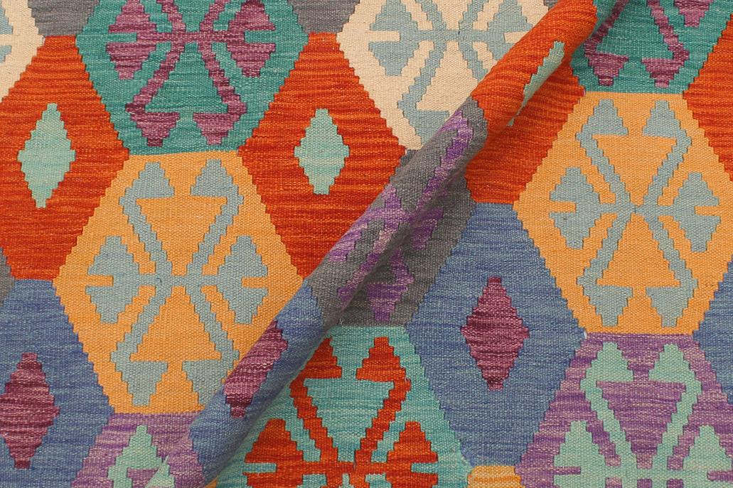Elevate the elegance of your home with this stunning hand-woven tribal Kilim wool rug. Meticulously crafted on a loom by the Nomad Turkman people using hand-spun wool and 100% natural vegetable dyes, these rugs are recognized for their repetitive geometric patterns, incorporating naturalistic floral and traditional designs. The contemporary fashion palette results in bold, sharp patterns that are incredibly versatile, as the pattern is the same on both sides. These reversible rugs feature a lighter shade on one side and brighter colors on the other, providing versatility according to preference. These unique rugs are made by knotting short strands of different colors onto the warps and securing them by tightly pressing the wefts. The designs are created by interweaving the various colored wefts and warps. Kilims are known for their exceptional durability and versatility, making them truly unique rugs.