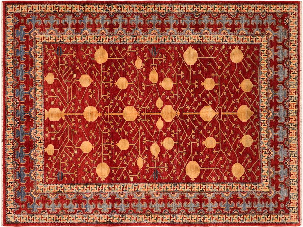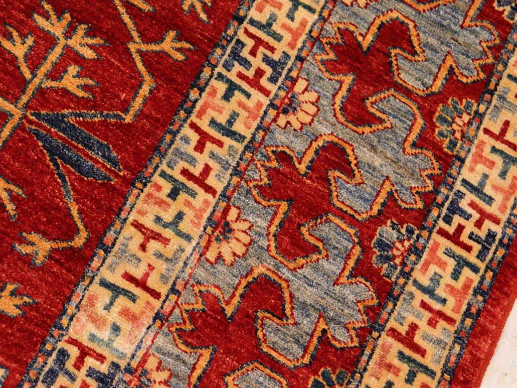 Embellish your home with this exquisitely hand-knotted Super Kazak Rug made with the finest hand spun wool and all vegetable dyes. Demonstrating incredible attention to detail, this hand-knotted masterpiece features an intricate Super Kazak pattern in a classic color palette. Made in the Caucasian designs from Russia and the northern Persian empire, each Super Kazak incorporates distinctive tribal flavor with elements such as the stepped hooted polygons, geometrical medallions, animals and rosettes. The straight, clean lines and bold tones embody the weaving style of the Armenian and Afghani weavers known for these iconic designs. This magnificent rug featuring soft luscious pile and is made with handspun wool and natural dyes to produces soft luminous shades causing a beautiful sheen. With geometric designs and bold vibrant saturated colors predominately blues, reds, greens, and gold make a bold statement in any decor. The construction technique used ensures that the designs and colors Ae capable to withstand heavy traffic area.