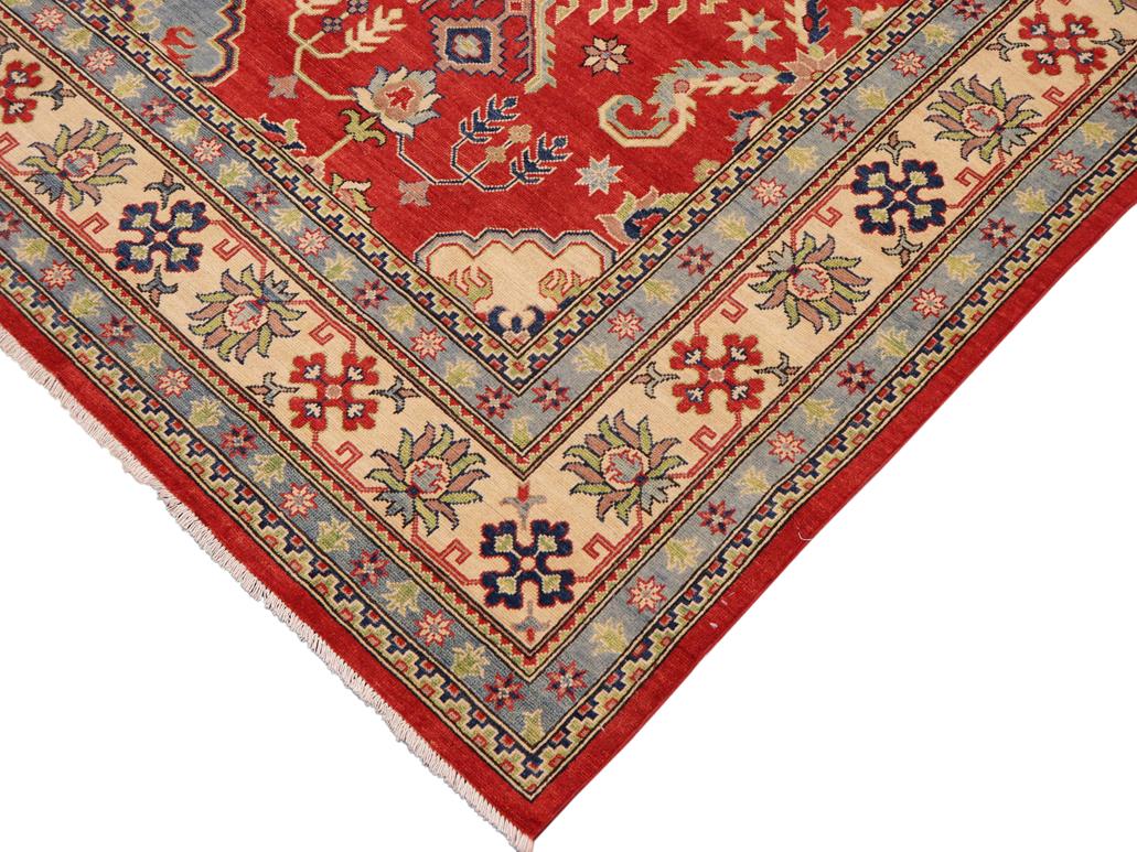 Embellish your home with this exquisitely hand-knotted Super Kazak Rug made with the finest hand spun wool and all vegetable dyes. Demonstrating incredible attention to detail, this hand-knotted masterpiece features an intricate Super Kazak pattern in a classic color palette. Made in the Caucasian designs from Russia and the northern Persian empire, each Super Kazak incorporates distinctive tribal flavor with elements such as the stepped hooted polygons, geometrical medallions, animals and rosettes. The straight, clean lines and bold tones embody the weaving style of the Armenian and Afghani weavers known for these iconic designs. This magnificent rug featuring soft luscious pile and is made with handspun wool and natural dyes to produces soft luminous shades causing a beautiful sheen. With geometric designs and bold vibrant saturated colors predominately blues, reds, greens, and gold make a bold statement in any decor. The construction technique used ensures that the designs and colors Ae capable to withstand heavy traffic area.