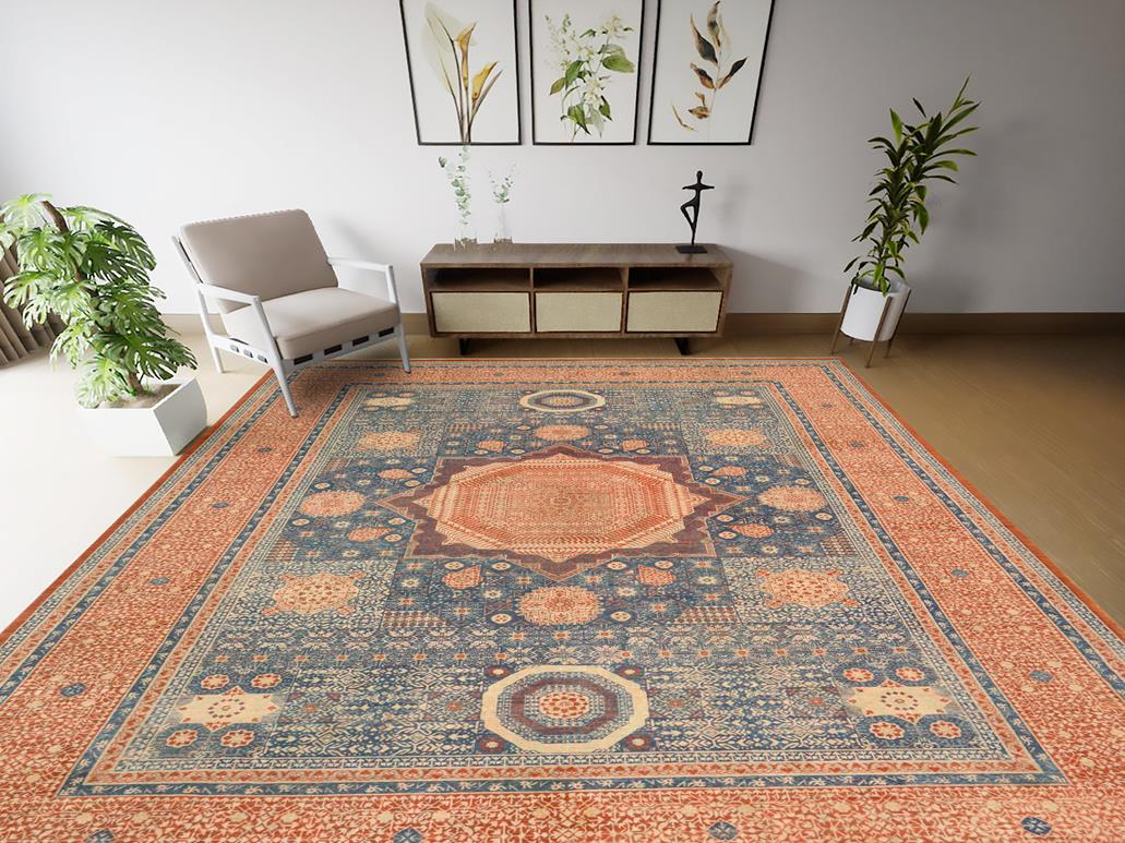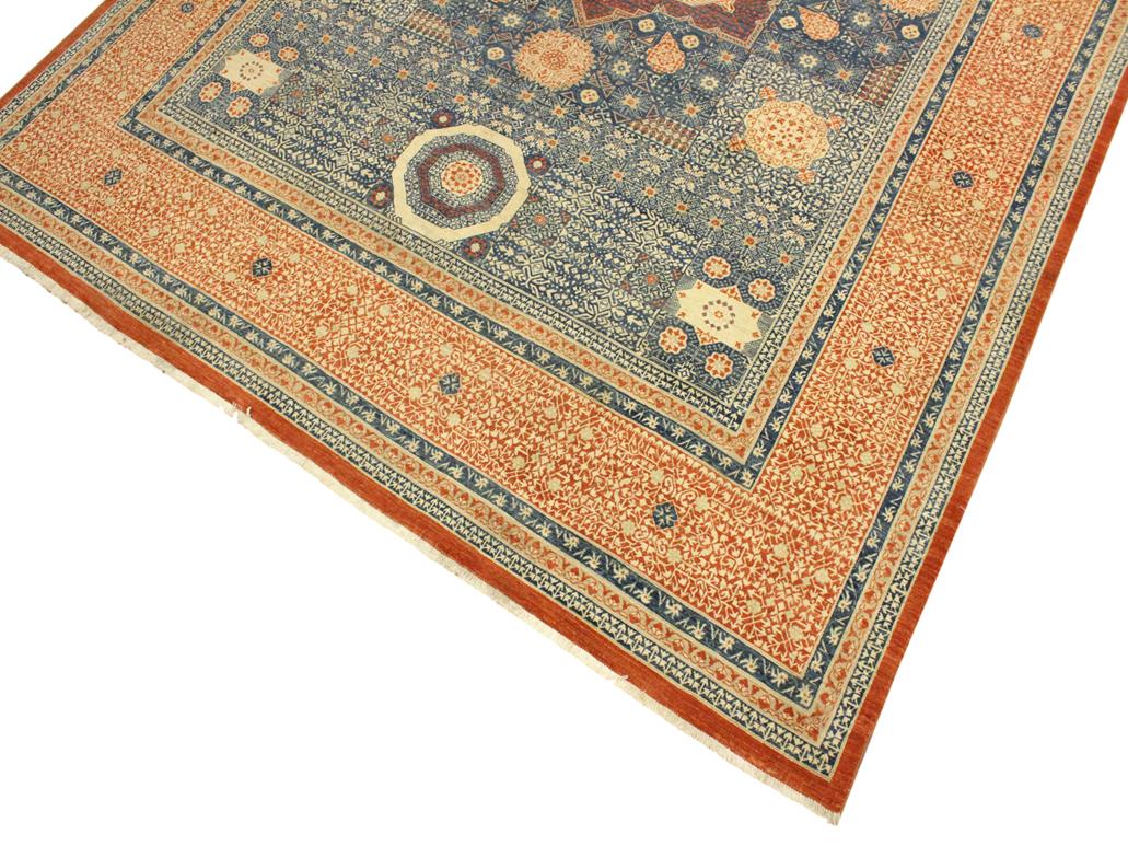 With strict standards of craftsmanship and quality of materials used this magnificent hand-knotted rug features a Mamluk design characterized by their unique weave and fine quality wool. Made for the Sultans in the 15th Century, Mamluk hand-knotted rugs devour design and structural characteristics that are based on a unique interplay of geometric forms with beauteous medallions made up of intersecting compartments and subtle layering making it a masterpiece of its own. This magnificent rug made with handspun wool and natural dyes features soft and lustrous, almost silk-like wool which gives it an elegant royal look. The breath-taking color pallet with an intricate geometric Mamluk design brings a rich form of cultural art to any decor. The unique hand-knotted rug narrates an archival story of the Mamluk Sultans and the Ottoman Empire bringing a rich sense of history, elegance, and sophistication in any decor.