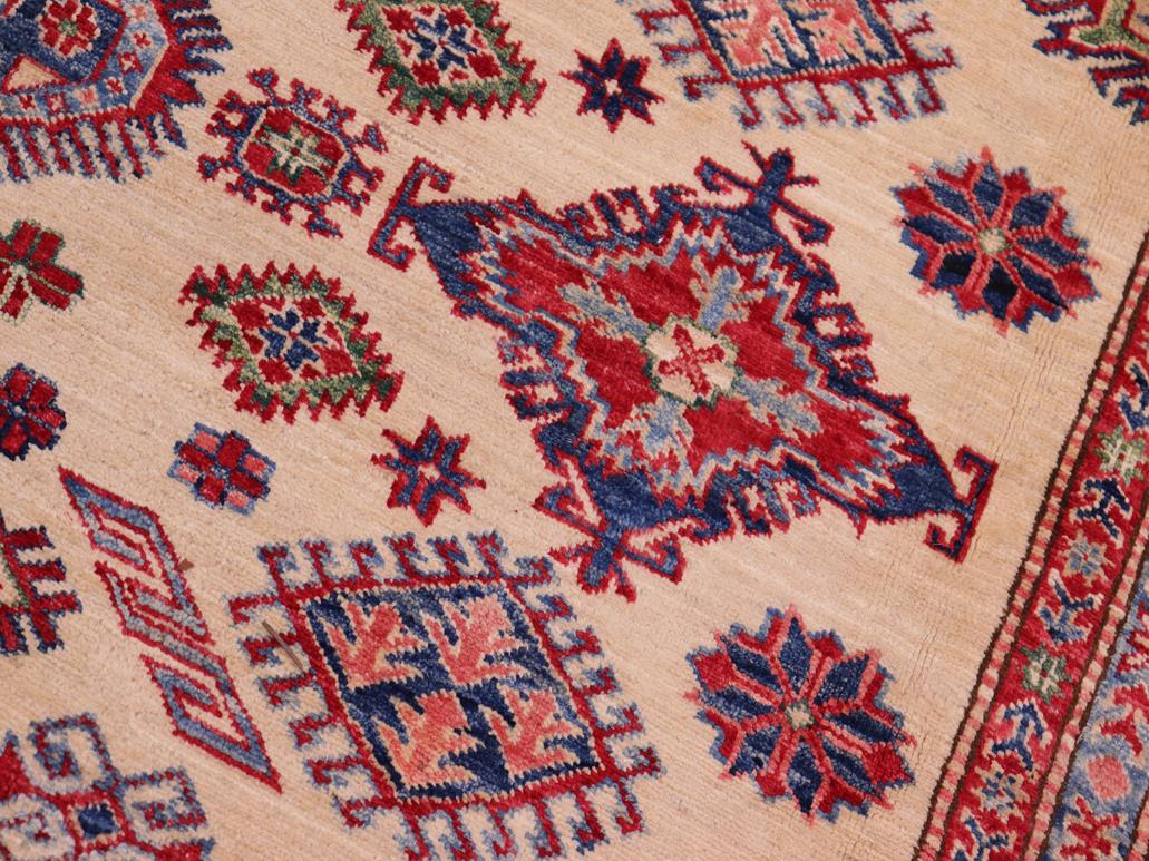Embellish your home with this exquisitely hand-knotted Super Kazak Rug made with the finest hand spun wool and all vegetable dyes. Demonstrating incredible attention to detail, this hand-knotted masterpiece features an intricate Super Kazak pattern in a classic color palette. Made in the Caucasian designs from Russia and the northern Persian empire, each Super Kazak incorporates distinctive tribal flavor with elements such as the stepped hooted polygons, geometrical medallions, animals and rosettes. The straight, clean lines and bold tones embody the weaving style of the Armenian and Afghani weavers known for these iconic designs. This magnificent rug featuring soft luscious pile and is made with handspun wool and natural dyes to produces soft luminous shades causing a beautiful sheen. With geometric designs and bold vibrant saturated colors predominately blues, reds, greens, and gold make a bold statement in any decor. The construction technique used ensures that the designs and colors Ae capable to withstand heavy traffic area.