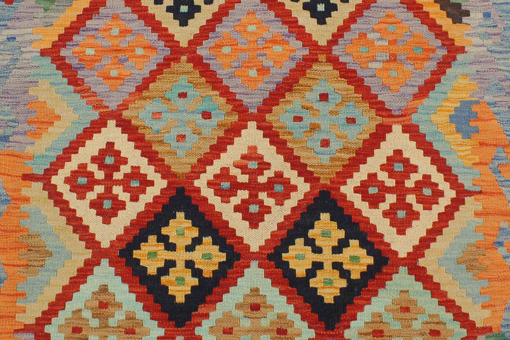Elevate the elegance of your home with this stunning hand-woven tribal Kilim wool rug. Meticulously crafted on a loom by the Nomad Turkman people using hand-spun wool and 100% natural vegetable dyes, these rugs are recognized for their repetitive geometric patterns, incorporating naturalistic floral and traditional designs. The contemporary fashion palette results in bold, sharp patterns that are incredibly versatile, as the pattern is the same on both sides. These reversible rugs feature a lighter shade on one side and brighter colors on the other, providing versatility according to preference. These unique rugs are made by knotting short strands of different colors onto the warps and securing them by tightly pressing the wefts. The designs are created by interweaving the various colored wefts and warps. Kilims are known for their exceptional durability and versatility, making them truly unique rugs.