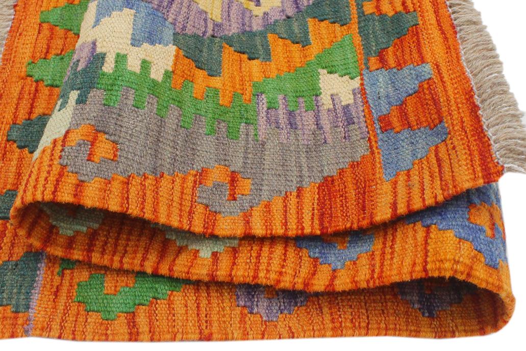 Elevate the elegance of your home with this stunning hand-woven tribal Kilim wool rug. Meticulously crafted on a loom by the Nomad Turkman people using hand-spun wool and 100% natural vegetable dyes, these rugs are recognized for their repetitive geometric patterns, incorporating naturalistic floral and traditional designs. The contemporary fashion palette results in bold, sharp patterns that are incredibly versatile, as the pattern is the same on both sides. These reversible rugs feature a lighter shade on one side and brighter colors on the other, providing versatility according to preference. These unique rugs are made by knotting short strands of different colors onto the warps and securing them by tightly pressing the wefts. The designs are created by interweaving the various colored wefts and warps. Kilims are known for their exceptional durability and versatility, making them truly unique rugs.