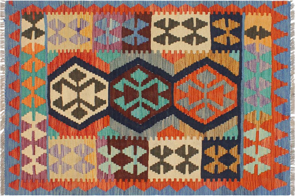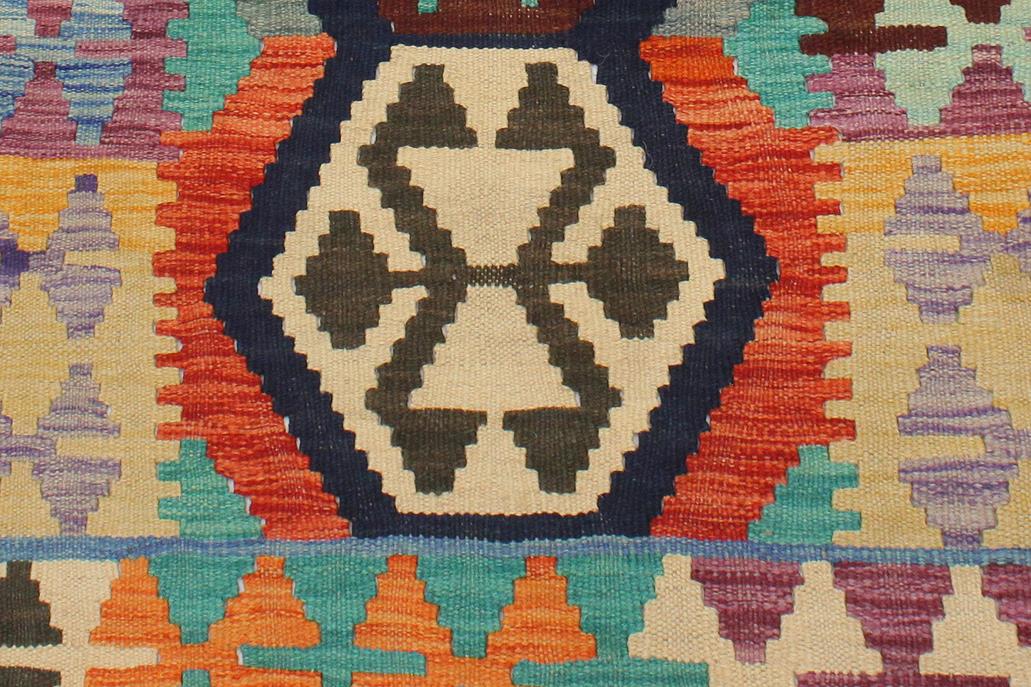 Elevate the elegance of your home with this stunning hand-woven tribal Kilim wool rug. Meticulously crafted on a loom by the Nomad Turkman people using hand-spun wool and 100% natural vegetable dyes, these rugs are recognized for their repetitive geometric patterns, incorporating naturalistic floral and traditional designs. The contemporary fashion palette results in bold, sharp patterns that are incredibly versatile, as the pattern is the same on both sides. These reversible rugs feature a lighter shade on one side and brighter colors on the other, providing versatility according to preference. These unique rugs are made by knotting short strands of different colors onto the warps and securing them by tightly pressing the wefts. The designs are created by interweaving the various colored wefts and warps. Kilims are known for their exceptional durability and versatility, making them truly unique rugs.