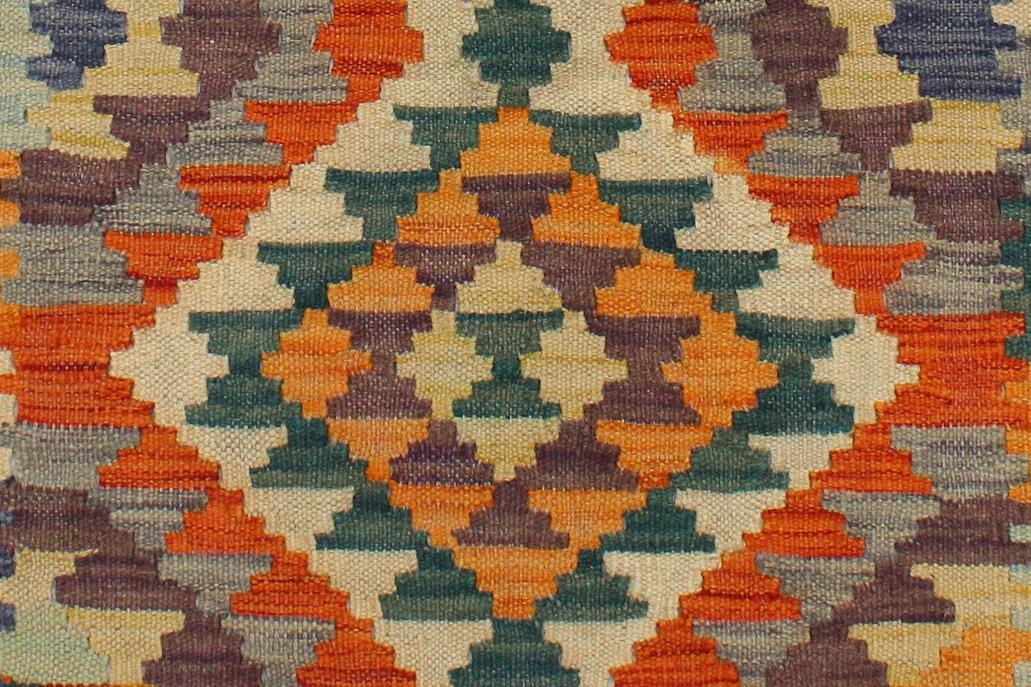 Elevate the elegance of your home with this stunning hand-woven tribal Kilim wool rug. Meticulously crafted on a loom by the Nomad Turkman people using hand-spun wool and 100% natural vegetable dyes, these rugs are recognized for their repetitive geometric patterns, incorporating naturalistic floral and traditional designs. The contemporary fashion palette results in bold, sharp patterns that are incredibly versatile, as the pattern is the same on both sides. These reversible rugs feature a lighter shade on one side and brighter colors on the other, providing versatility according to preference. These unique rugs are made by knotting short strands of different colors onto the warps and securing them by tightly pressing the wefts. The designs are created by interweaving the various colored wefts and warps. Kilims are known for their exceptional durability and versatility, making them truly unique rugs.
