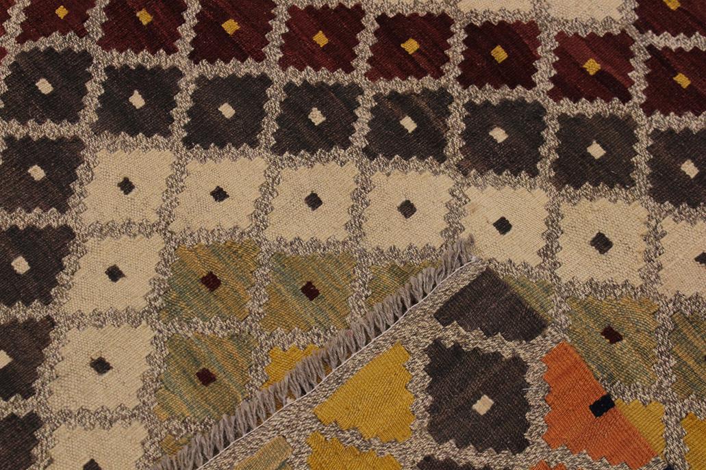 Elevate the elegance of your home with this stunning hand-woven tribal Kilim wool rug. Meticulously crafted on a loom by the Nomad Turkman people using hand-spun wool and 100% natural vegetable dyes, these rugs are recognized for their repetitive geometric patterns, incorporating naturalistic floral and traditional designs. The contemporary fashion palette results in bold, sharp patterns that are incredibly versatile, as the pattern is the same on both sides. These reversible rugs feature a lighter shade on one side and brighter colors on the other, providing versatility according to preference. These unique rugs are made by knotting short strands of different colors onto the warps and securing them by tightly pressing the wefts. The designs are created by interweaving the various colored wefts and warps. Kilims are known for their exceptional durability and versatility, making them truly unique rugs.
