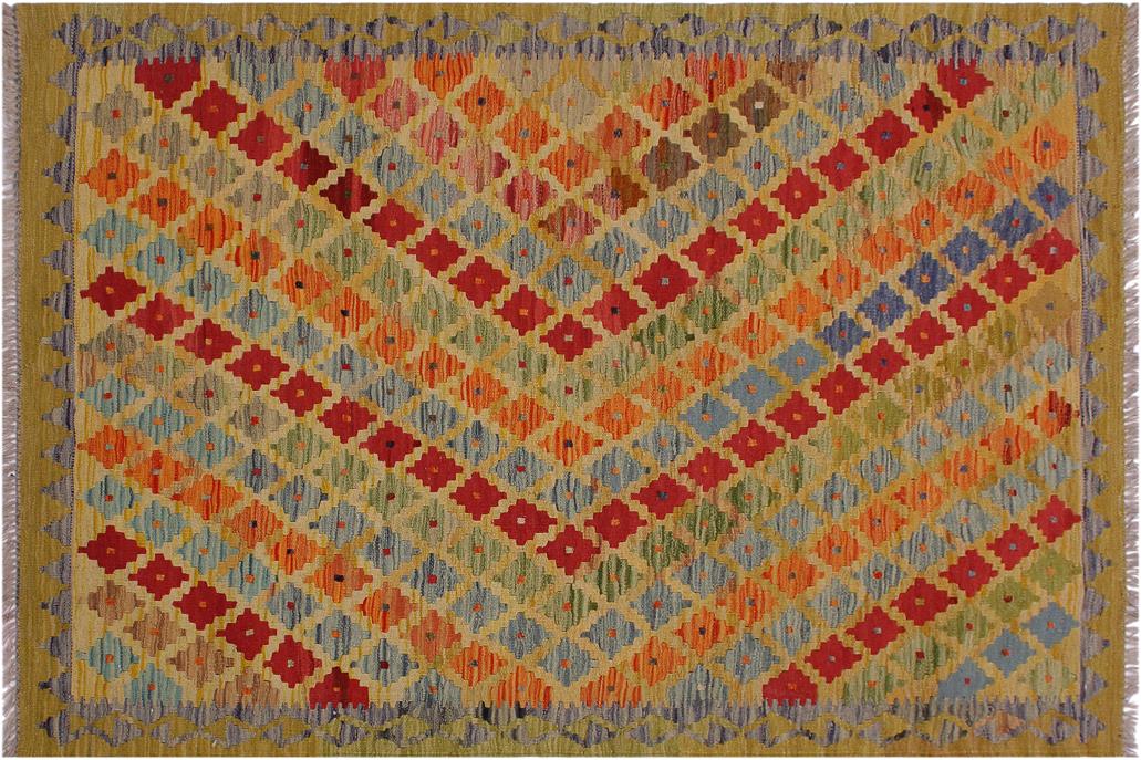 Elevate the elegance of your home with this stunning hand-woven tribal Kilim wool rug. Meticulously crafted on a loom by the Nomad Turkman people using hand-spun wool and 100% natural vegetable dyes, these rugs are recognized for their repetitive geometric patterns, incorporating naturalistic floral and traditional designs. The contemporary fashion palette results in bold, sharp patterns that are incredibly versatile, as the pattern is the same on both sides. These reversible rugs feature a lighter shade on one side and brighter colors on the other, providing versatility according to preference. These unique rugs are made by knotting short strands of different colors onto the warps and securing them by tightly pressing the wefts. The designs are created by interweaving the various colored wefts and warps. Kilims are known for their exceptional durability and versatility, making them truly unique rugs.