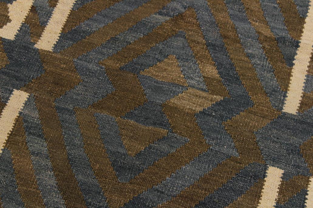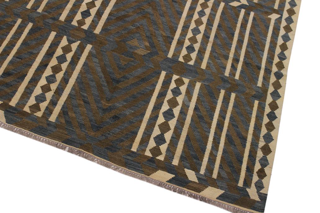 Elevate the elegance of your home with this stunning hand-woven tribal Kilim wool rug. Meticulously crafted on a loom by the Nomad Turkman people using hand-spun wool and 100% natural vegetable dyes, these rugs are recognized for their repetitive geometric patterns, incorporating naturalistic floral and traditional designs. The contemporary fashion palette results in bold, sharp patterns that are incredibly versatile, as the pattern is the same on both sides. These reversible rugs feature a lighter shade on one side and brighter colors on the other, providing versatility according to preference. These unique rugs are made by knotting short strands of different colors onto the warps and securing them by tightly pressing the wefts. The designs are created by interweaving the various colored wefts and warps. Kilims are known for their exceptional durability and versatility, making them truly unique rugs.
