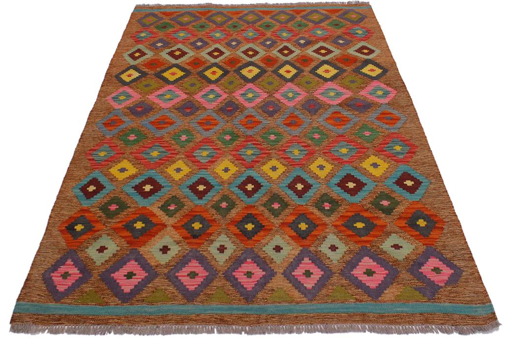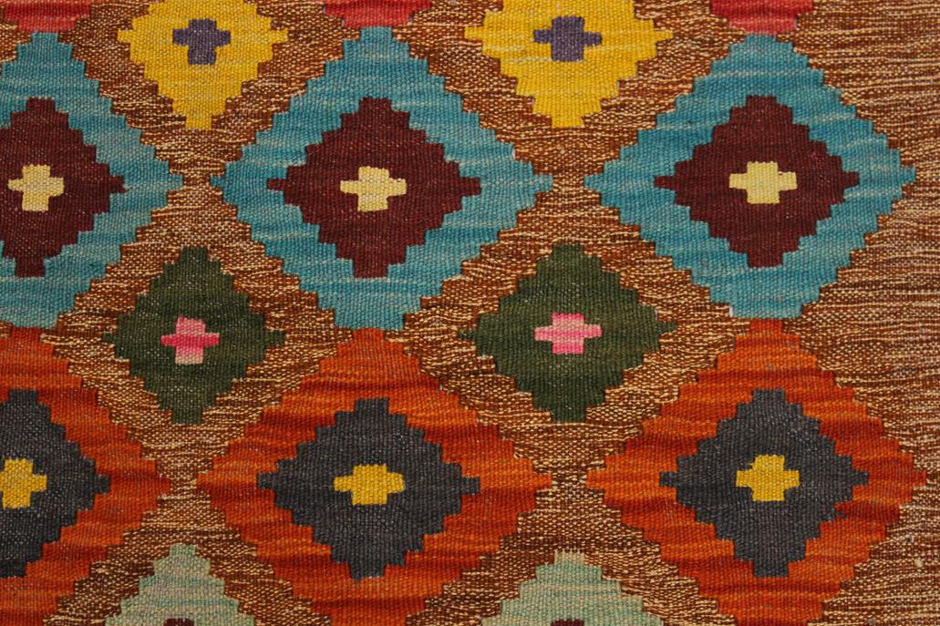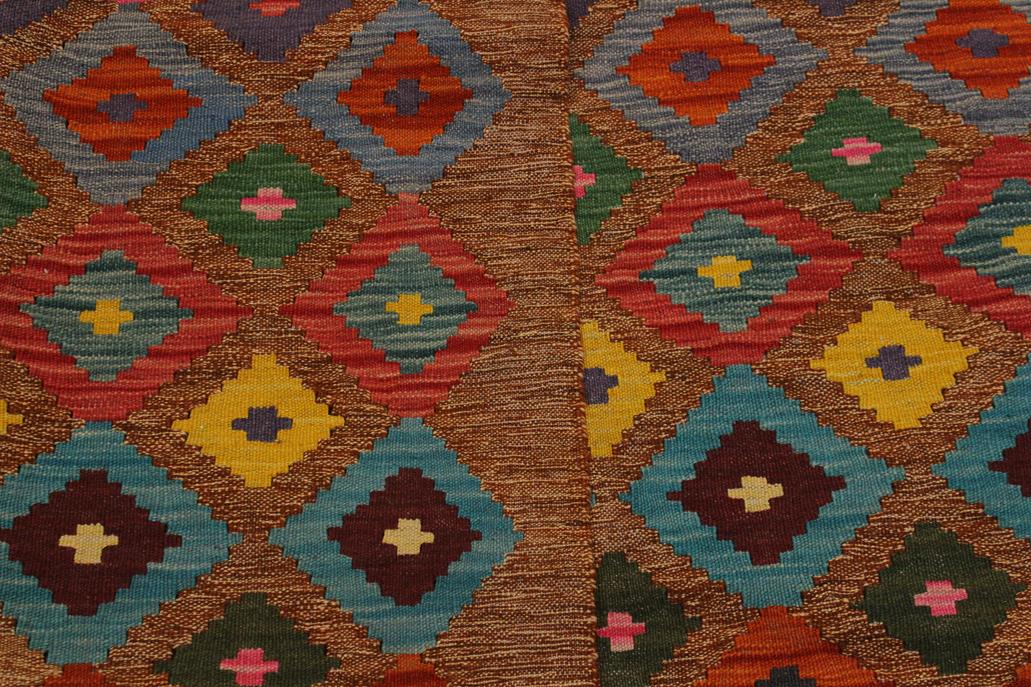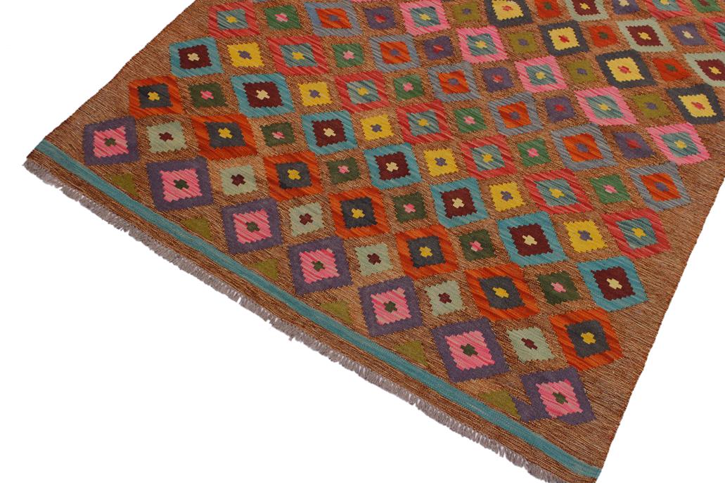 Elevate the elegance of your home with this stunning hand-woven tribal Kilim wool rug. Meticulously crafted on a loom by the Nomad Turkman people using hand-spun wool and 100% natural vegetable dyes, these rugs are recognized for their repetitive geometric patterns, incorporating naturalistic floral and traditional designs. The contemporary fashion palette results in bold, sharp patterns that are incredibly versatile, as the pattern is the same on both sides. These reversible rugs feature a lighter shade on one side and brighter colors on the other, providing versatility according to preference. These unique rugs are made by knotting short strands of different colors onto the warps and securing them by tightly pressing the wefts. The designs are created by interweaving the various colored wefts and warps. Kilims are known for their exceptional durability and versatility, making them truly unique rugs.