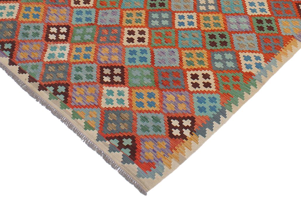 Elevate the elegance of your home with this stunning hand-woven tribal Kilim wool rug. Meticulously crafted on a loom by the Nomad Turkman people using hand-spun wool and 100% natural vegetable dyes, these rugs are recognized for their repetitive geometric patterns, incorporating naturalistic floral and traditional designs. The contemporary fashion palette results in bold, sharp patterns that are incredibly versatile, as the pattern is the same on both sides. These reversible rugs feature a lighter shade on one side and brighter colors on the other, providing versatility according to preference. These unique rugs are made by knotting short strands of different colors onto the warps and securing them by tightly pressing the wefts. The designs are created by interweaving the various colored wefts and warps. Kilims are known for their exceptional durability and versatility, making them truly unique rugs.