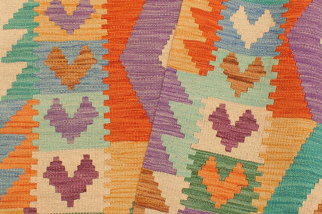 Elevate the elegance of your home with this stunning hand-woven tribal Kilim wool rug. Meticulously crafted on a loom by the Nomad Turkman people using hand-spun wool and 100% natural vegetable dyes, these rugs are recognized for their repetitive geometric patterns, incorporating naturalistic floral and traditional designs. The contemporary fashion palette results in bold, sharp patterns that are incredibly versatile, as the pattern is the same on both sides. These reversible rugs feature a lighter shade on one side and brighter colors on the other, providing versatility according to preference. These unique rugs are made by knotting short strands of different colors onto the warps and securing them by tightly pressing the wefts. The designs are created by interweaving the various colored wefts and warps. Kilims are known for their exceptional durability and versatility, making them truly unique rugs.