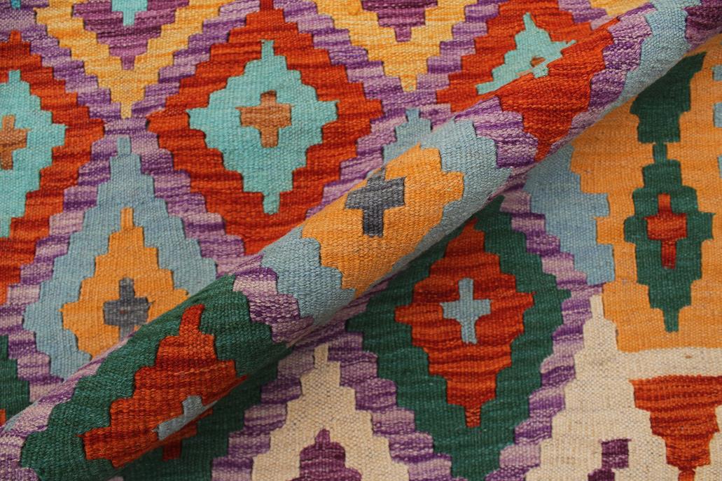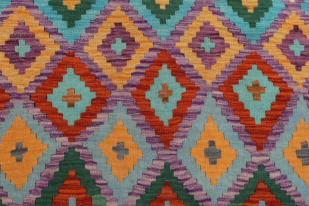 Elevate the elegance of your home with this stunning hand-woven tribal Kilim wool rug. Meticulously crafted on a loom by the Nomad Turkman people using hand-spun wool and 100% natural vegetable dyes, these rugs are recognized for their repetitive geometric patterns, incorporating naturalistic floral and traditional designs. The contemporary fashion palette results in bold, sharp patterns that are incredibly versatile, as the pattern is the same on both sides. These reversible rugs feature a lighter shade on one side and brighter colors on the other, providing versatility according to preference. These unique rugs are made by knotting short strands of different colors onto the warps and securing them by tightly pressing the wefts. The designs are created by interweaving the various colored wefts and warps. Kilims are known for their exceptional durability and versatility, making them truly unique rugs.