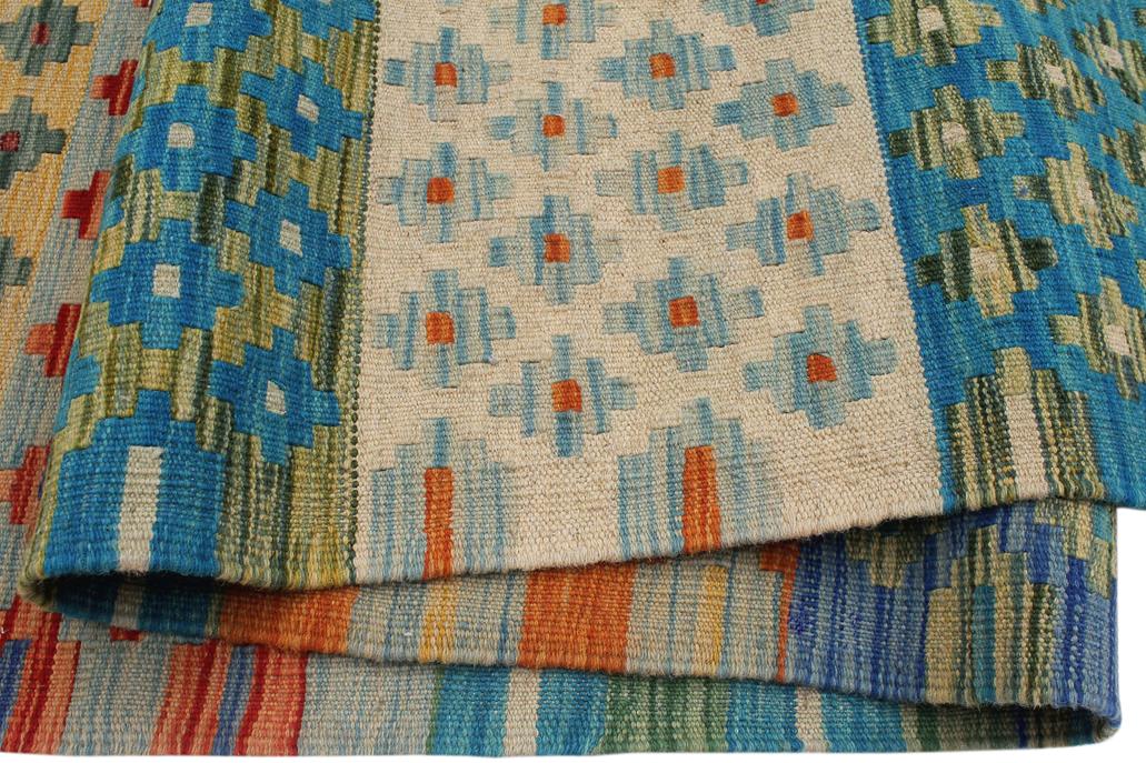 Elevate the elegance of your home with this stunning hand-woven tribal Kilim wool rug. Meticulously crafted on a loom by the Nomad Turkman people using hand-spun wool and 100% natural vegetable dyes, these rugs are recognized for their repetitive geometric patterns, incorporating naturalistic floral and traditional designs. The contemporary fashion palette results in bold, sharp patterns that are incredibly versatile, as the pattern is the same on both sides. These reversible rugs feature a lighter shade on one side and brighter colors on the other, providing versatility according to preference. These unique rugs are made by knotting short strands of different colors onto the warps and securing them by tightly pressing the wefts. The designs are created by interweaving the various colored wefts and warps. Kilims are known for their exceptional durability and versatility, making them truly unique rugs.