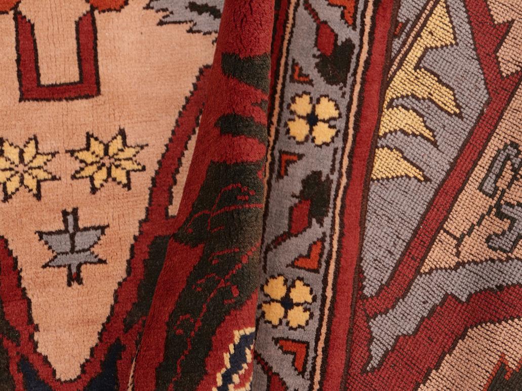 Create a new dimension of style in your home with this breath-taking semi-antique hand knotted Kargahi rug featuring incredible luxurious texture and appearance. Featuring vibrant awe-inspiring color pallet with an intricate geometrical design inspired by Uzbek and Kazak style, these one-of-a-kind rugs are a unique piece of world art that will enhance your living space. Made by skilled Uzbek Afghan master weavers in hand-spun wool and all vegetable dyes, Kargahi rugs blend in traditional to modern decor seamlessly.