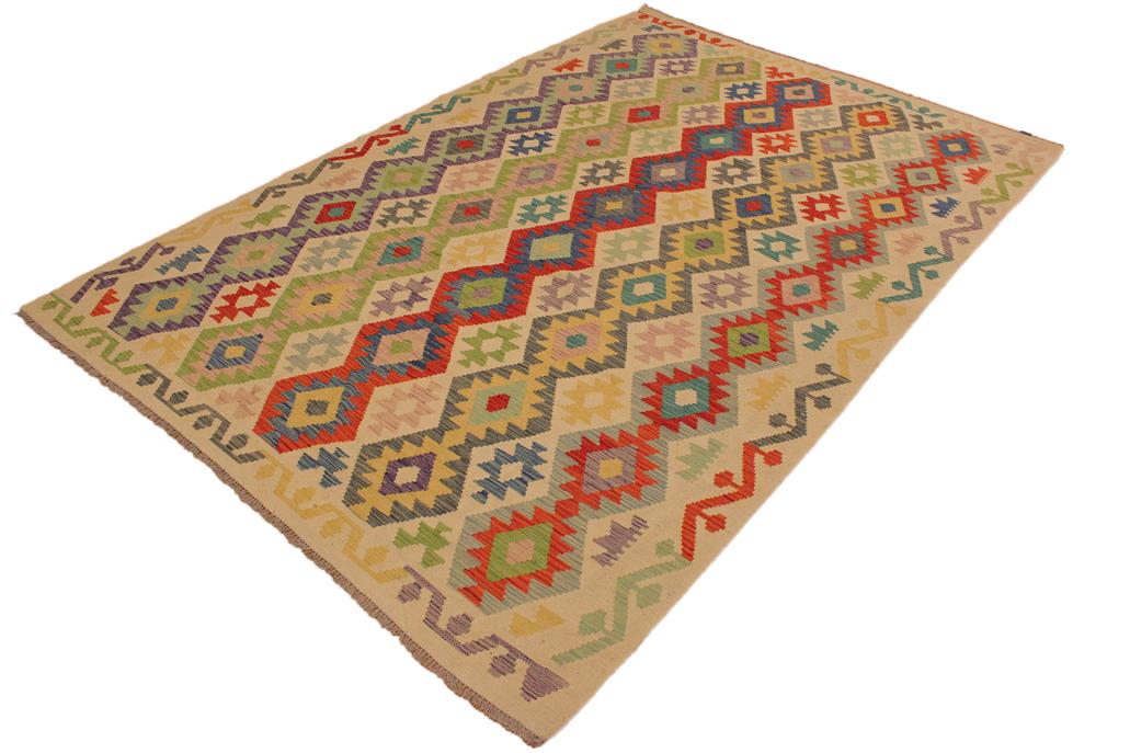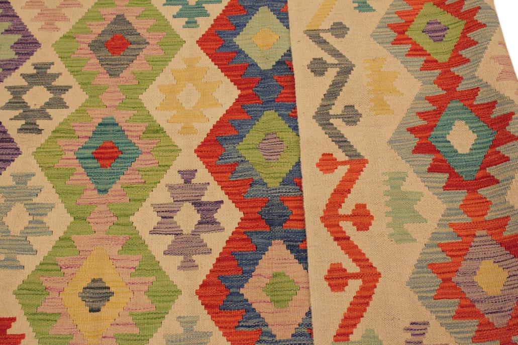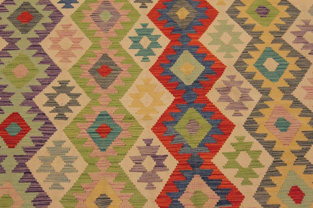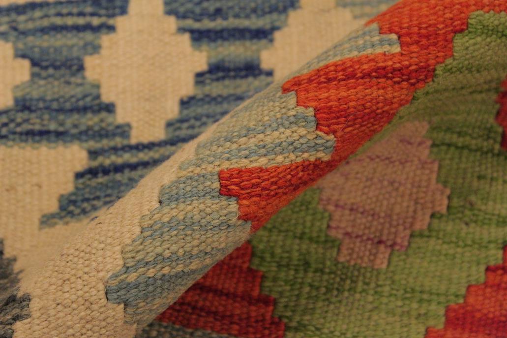 Elevate the elegance of your home with this stunning hand-woven tribal Kilim wool rug. Meticulously crafted on a loom by the Nomad Turkman people using hand-spun wool and 100% natural vegetable dyes, these rugs are recognized for their repetitive geometric patterns, incorporating naturalistic floral and traditional designs. The contemporary fashion palette results in bold, sharp patterns that are incredibly versatile, as the pattern is the same on both sides. These reversible rugs feature a lighter shade on one side and brighter colors on the other, providing versatility according to preference. These unique rugs are made by knotting short strands of different colors onto the warps and securing them by tightly pressing the wefts. The designs are created by interweaving the various colored wefts and warps. Kilims are known for their exceptional durability and versatility, making them truly unique rugs.
