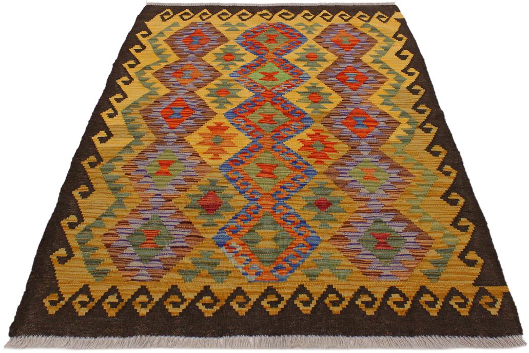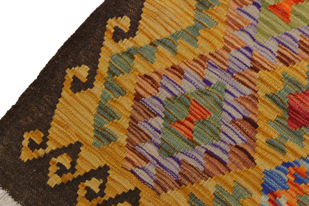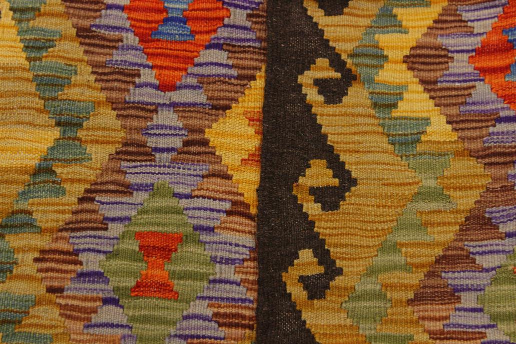 Elevate the elegance of your home with this stunning hand-woven tribal Kilim wool rug. Meticulously crafted on a loom by the Nomad Turkman people using hand-spun wool and 100% natural vegetable dyes, these rugs are recognized for their repetitive geometric patterns, incorporating naturalistic floral and traditional designs. The contemporary fashion palette results in bold, sharp patterns that are incredibly versatile, as the pattern is the same on both sides. These reversible rugs feature a lighter shade on one side and brighter colors on the other, providing versatility according to preference. These unique rugs are made by knotting short strands of different colors onto the warps and securing them by tightly pressing the wefts. The designs are created by interweaving the various colored wefts and warps. Kilims are known for their exceptional durability and versatility, making them truly unique rugs.