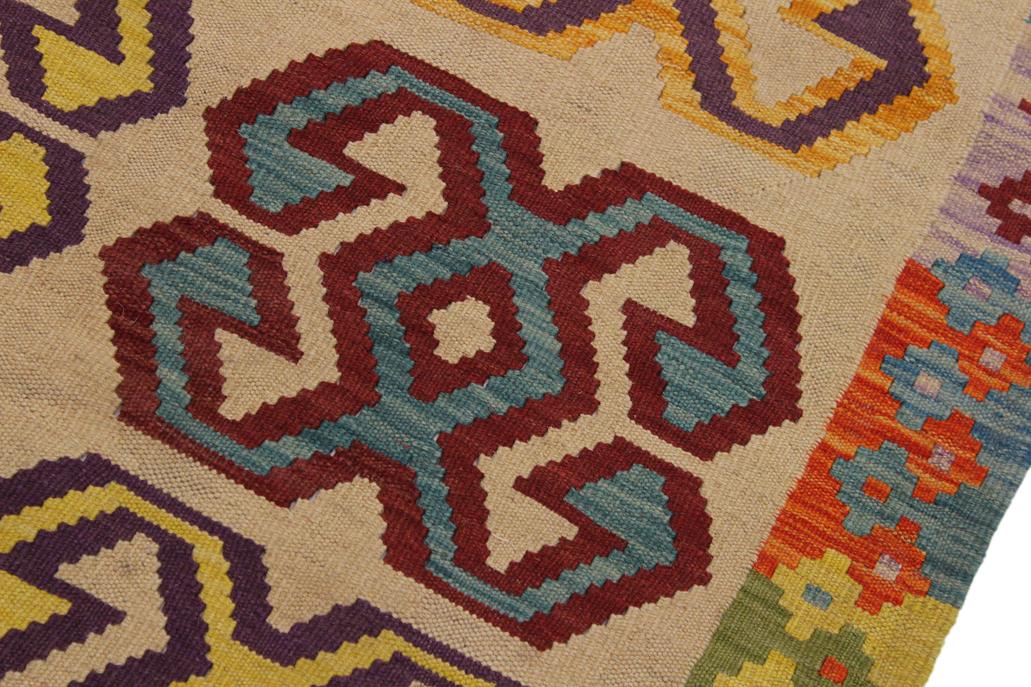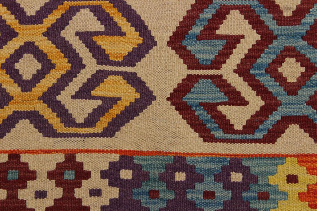 Elevate the elegance of your home with this stunning hand-woven tribal Kilim wool rug. Meticulously crafted on a loom by the Nomad Turkman people using hand-spun wool and 100% natural vegetable dyes, these rugs are recognized for their repetitive geometric patterns, incorporating naturalistic floral and traditional designs. The contemporary fashion palette results in bold, sharp patterns that are incredibly versatile, as the pattern is the same on both sides. These reversible rugs feature a lighter shade on one side and brighter colors on the other, providing versatility according to preference. These unique rugs are made by knotting short strands of different colors onto the warps and securing them by tightly pressing the wefts. The designs are created by interweaving the various colored wefts and warps. Kilims are known for their exceptional durability and versatility, making them truly unique rugs.