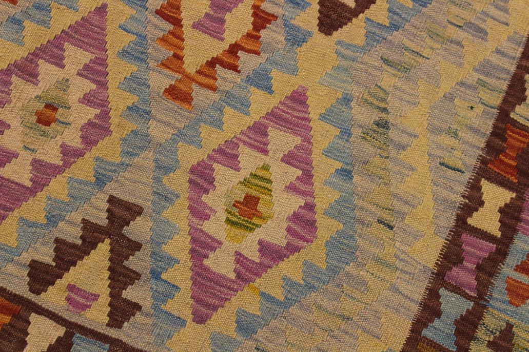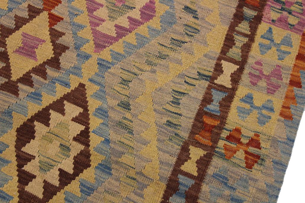Elevate the elegance of your home with this stunning hand-woven tribal Kilim wool rug. Meticulously crafted on a loom by the Nomad Turkman people using hand-spun wool and 100% natural vegetable dyes, these rugs are recognized for their repetitive geometric patterns, incorporating naturalistic floral and traditional designs. The contemporary fashion palette results in bold, sharp patterns that are incredibly versatile, as the pattern is the same on both sides. These reversible rugs feature a lighter shade on one side and brighter colors on the other, providing versatility according to preference. These unique rugs are made by knotting short strands of different colors onto the warps and securing them by tightly pressing the wefts. The designs are created by interweaving the various colored wefts and warps. Kilims are known for their exceptional durability and versatility, making them truly unique rugs.