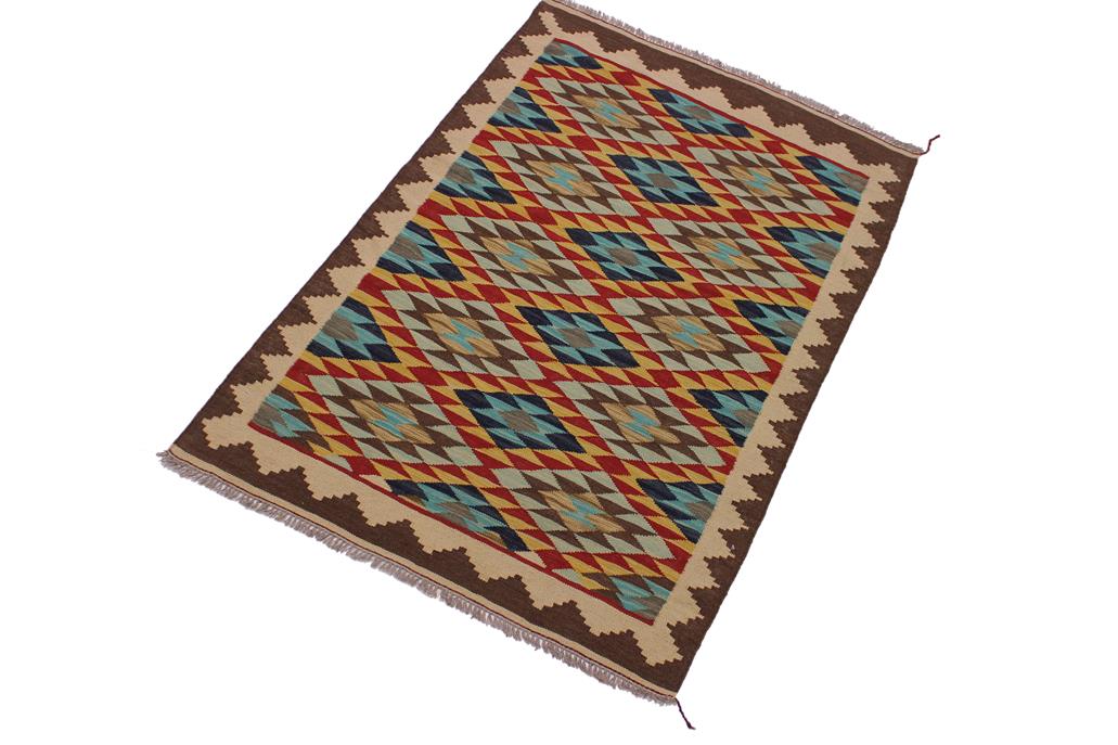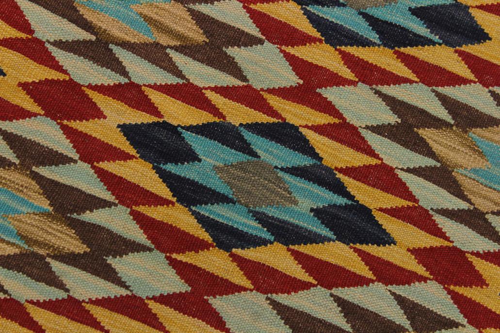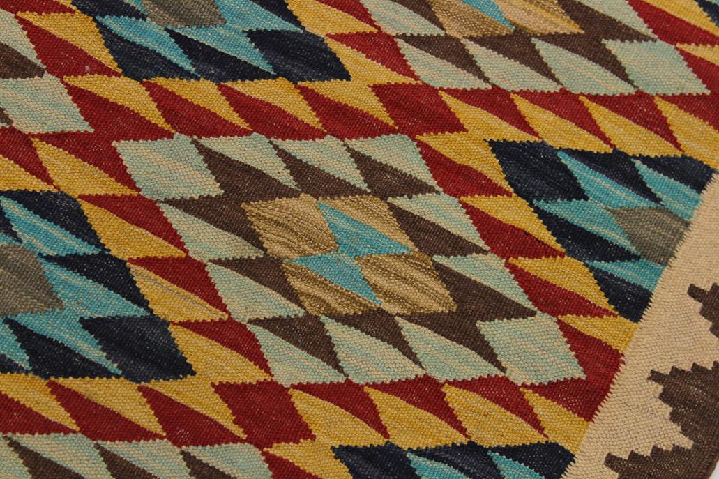 Elevate the elegance of your home with this stunning hand-woven tribal Kilim wool rug. Meticulously crafted on a loom by the Nomad Turkman people using hand-spun wool and 100% natural vegetable dyes, these rugs are recognized for their repetitive geometric patterns, incorporating naturalistic floral and traditional designs. The contemporary fashion palette results in bold, sharp patterns that are incredibly versatile, as the pattern is the same on both sides. These reversible rugs feature a lighter shade on one side and brighter colors on the other, providing versatility according to preference. These unique rugs are made by knotting short strands of different colors onto the warps and securing them by tightly pressing the wefts. The designs are created by interweaving the various colored wefts and warps. Kilims are known for their exceptional durability and versatility, making them truly unique rugs.