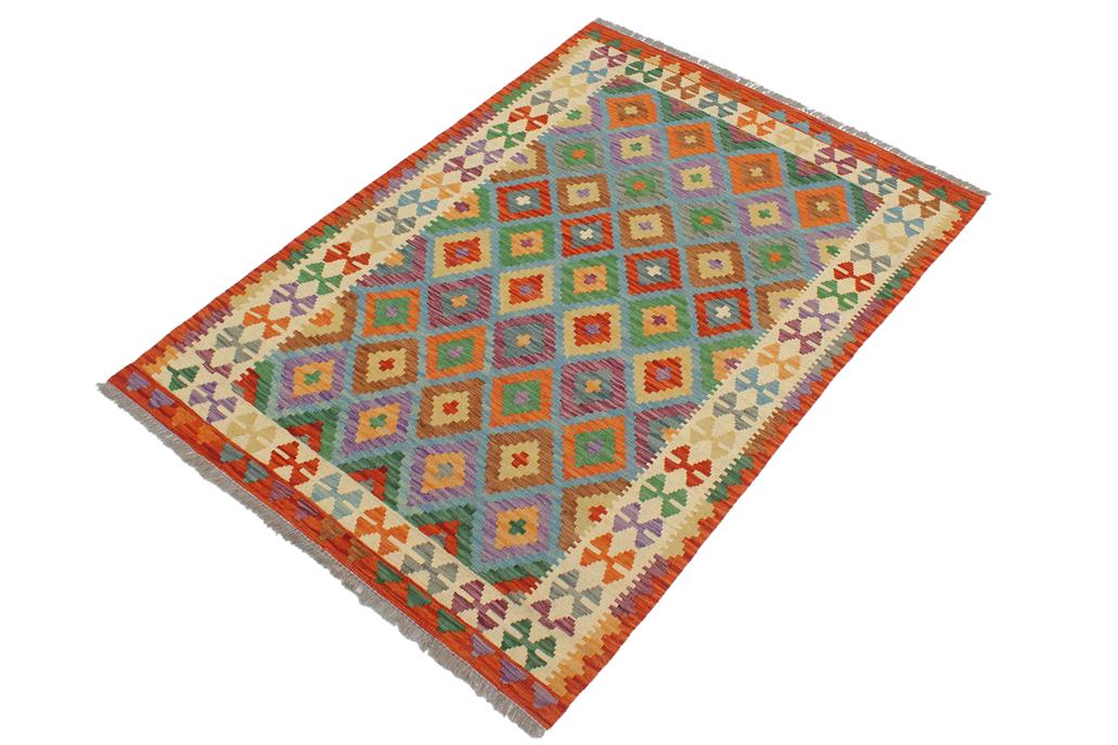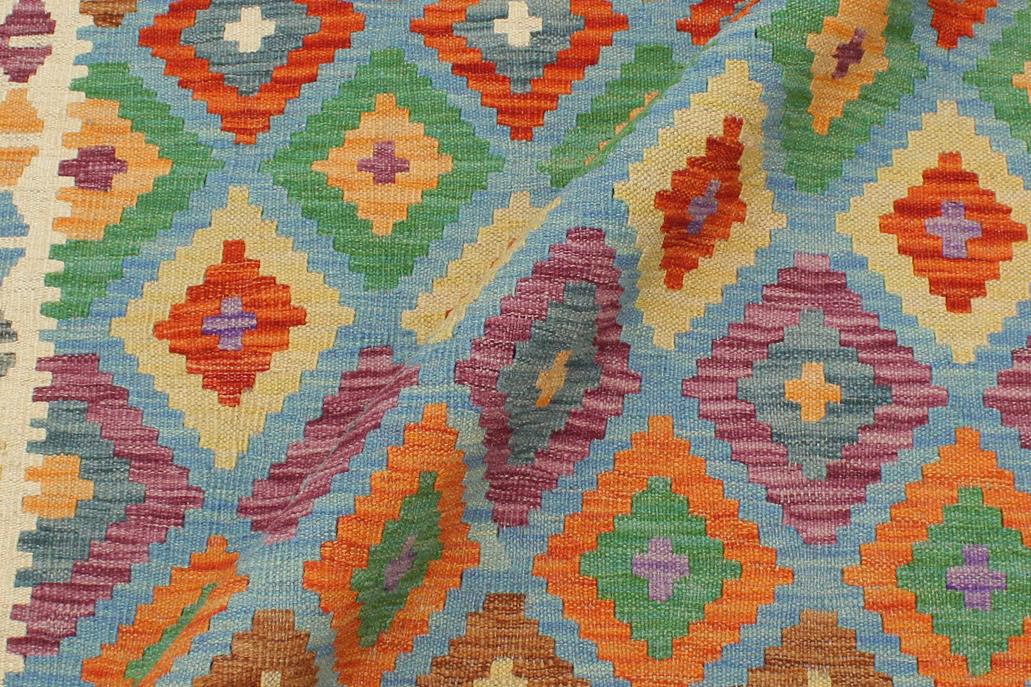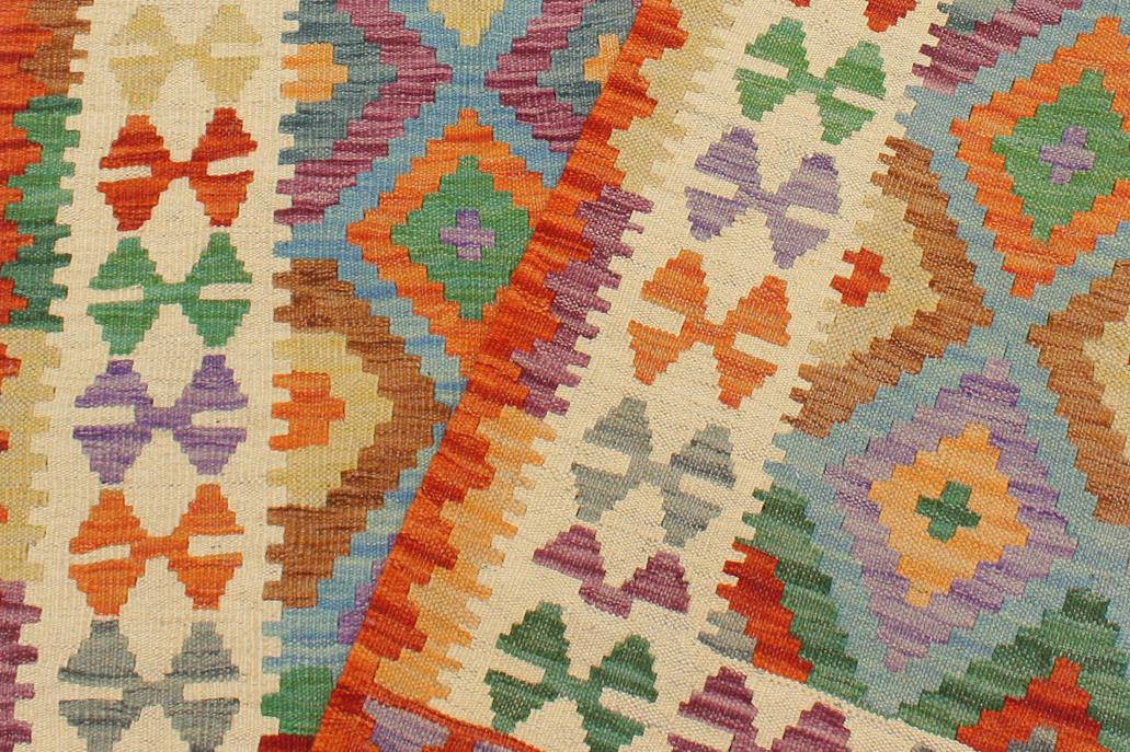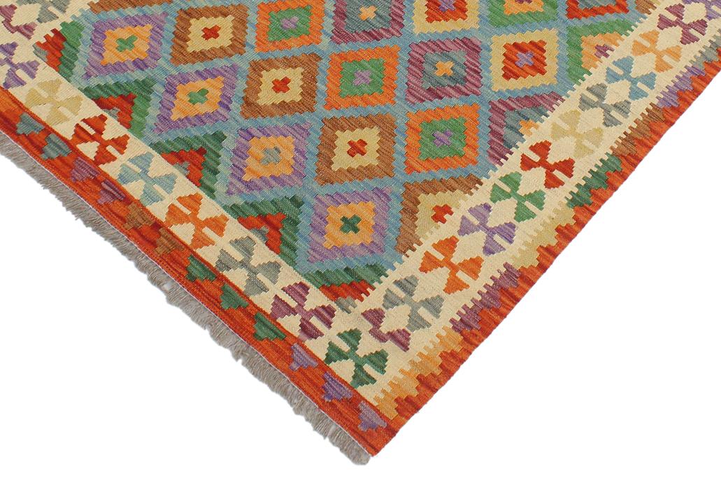 Elevate the elegance of your home with this stunning hand-woven tribal Kilim wool rug. Meticulously crafted on a loom by the Nomad Turkman people using hand-spun wool and 100% natural vegetable dyes, these rugs are recognized for their repetitive geometric patterns, incorporating naturalistic floral and traditional designs. The contemporary fashion palette results in bold, sharp patterns that are incredibly versatile, as the pattern is the same on both sides. These reversible rugs feature a lighter shade on one side and brighter colors on the other, providing versatility according to preference. These unique rugs are made by knotting short strands of different colors onto the warps and securing them by tightly pressing the wefts. The designs are created by interweaving the various colored wefts and warps. Kilims are known for their exceptional durability and versatility, making them truly unique rugs.