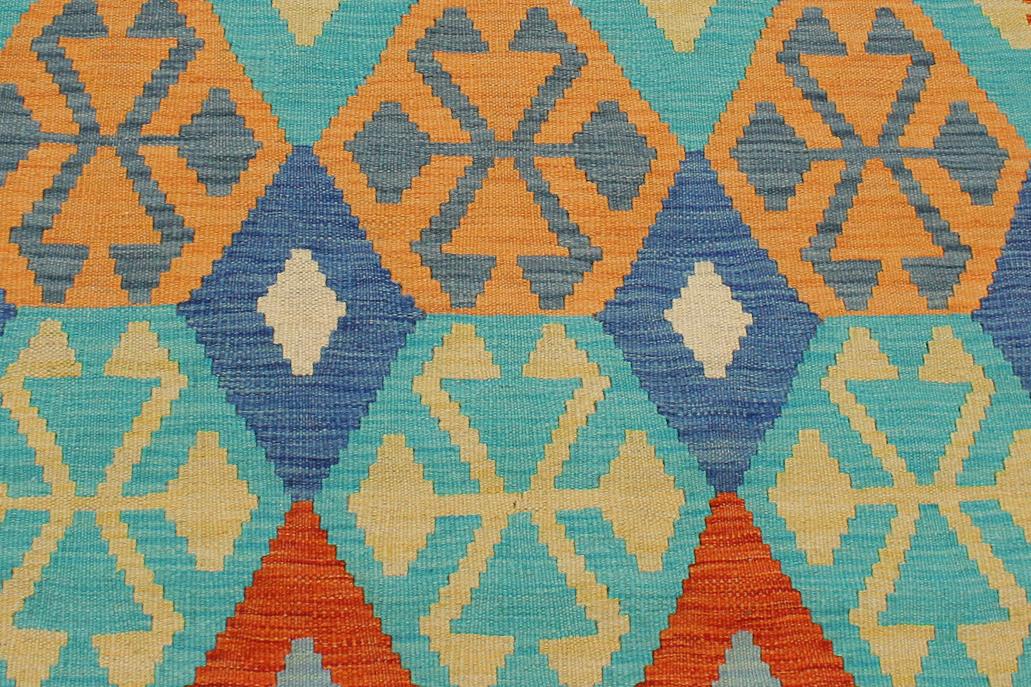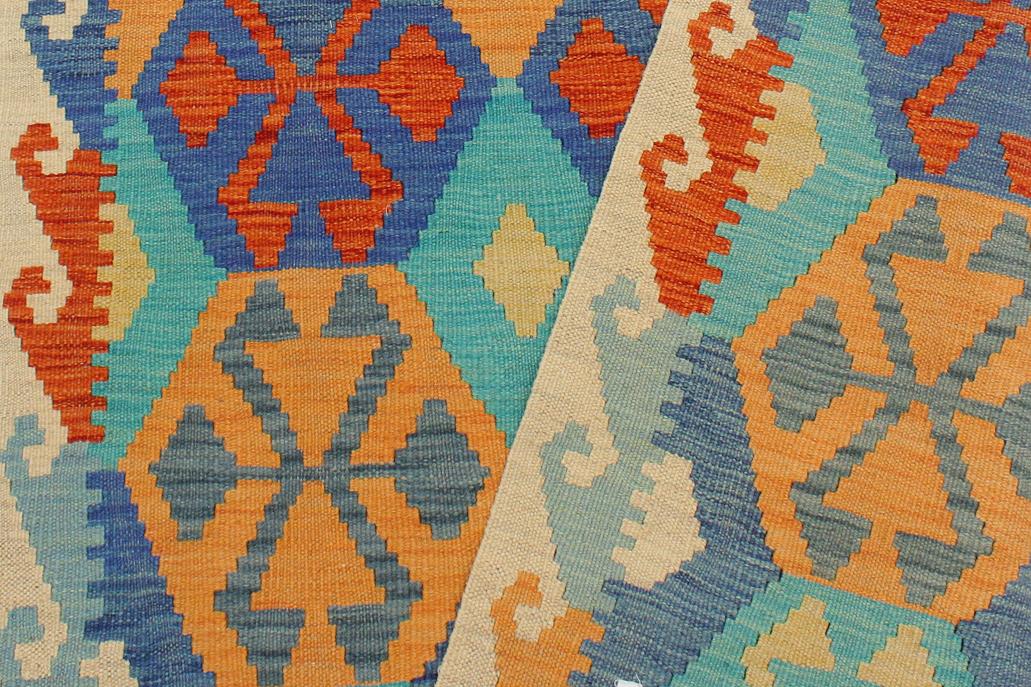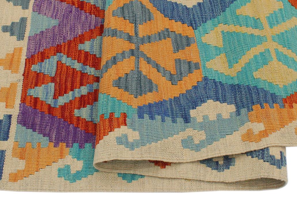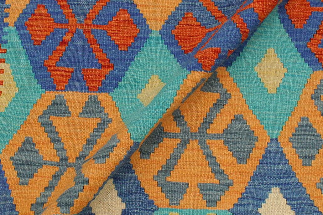 Elevate the elegance of your home with this stunning hand-woven tribal Kilim wool rug. Meticulously crafted on a loom by the Nomad Turkman people using hand-spun wool and 100% natural vegetable dyes, these rugs are recognized for their repetitive geometric patterns, incorporating naturalistic floral and traditional designs. The contemporary fashion palette results in bold, sharp patterns that are incredibly versatile, as the pattern is the same on both sides. These reversible rugs feature a lighter shade on one side and brighter colors on the other, providing versatility according to preference. These unique rugs are made by knotting short strands of different colors onto the warps and securing them by tightly pressing the wefts. The designs are created by interweaving the various colored wefts and warps. Kilims are known for their exceptional durability and versatility, making them truly unique rugs.