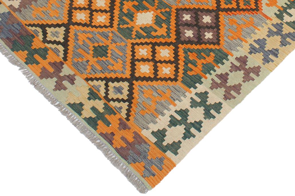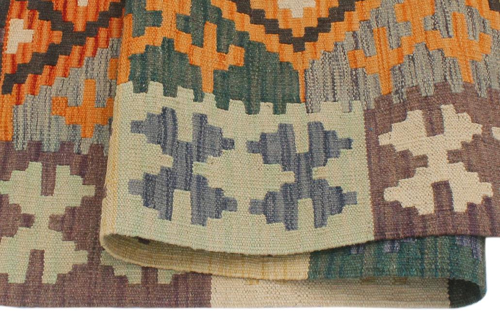 Elevate the elegance of your home with this stunning hand-woven tribal Kilim wool rug. Meticulously crafted on a loom by the Nomad Turkman people using hand-spun wool and 100% natural vegetable dyes, these rugs are recognized for their repetitive geometric patterns, incorporating naturalistic floral and traditional designs. The contemporary fashion palette results in bold, sharp patterns that are incredibly versatile, as the pattern is the same on both sides. These reversible rugs feature a lighter shade on one side and brighter colors on the other, providing versatility according to preference. These unique rugs are made by knotting short strands of different colors onto the warps and securing them by tightly pressing the wefts. The designs are created by interweaving the various colored wefts and warps. Kilims are known for their exceptional durability and versatility, making them truly unique rugs.