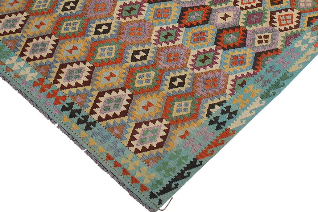 Elevate the elegance of your home with this stunning hand-woven tribal Kilim wool rug. Meticulously crafted on a loom by the Nomad Turkman people using hand-spun wool and 100% natural vegetable dyes, these rugs are recognized for their repetitive geometric patterns, incorporating naturalistic floral and traditional designs. The contemporary fashion palette results in bold, sharp patterns that are incredibly versatile, as the pattern is the same on both sides. These reversible rugs feature a lighter shade on one side and brighter colors on the other, providing versatility according to preference. These unique rugs are made by knotting short strands of different colors onto the warps and securing them by tightly pressing the wefts. The designs are created by interweaving the various colored wefts and warps. Kilims are known for their exceptional durability and versatility, making them truly unique rugs.