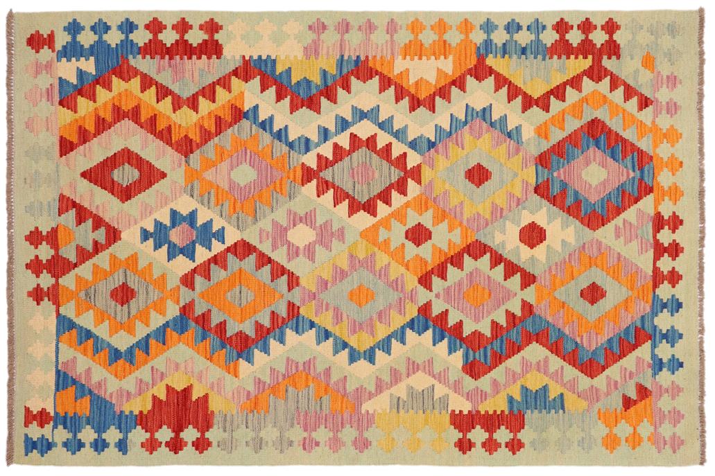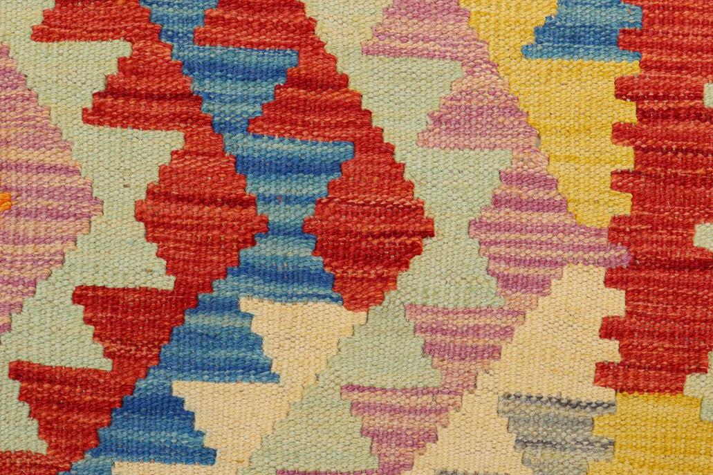 Elevate the elegance of your home with this stunning hand-woven tribal Kilim wool rug. Meticulously crafted on a loom by the Nomad Turkman people using hand-spun wool and 100% natural vegetable dyes, these rugs are recognized for their repetitive geometric patterns, incorporating naturalistic floral and traditional designs. The contemporary fashion palette results in bold, sharp patterns that are incredibly versatile, as the pattern is the same on both sides. These reversible rugs feature a lighter shade on one side and brighter colors on the other, providing versatility according to preference. These unique rugs are made by knotting short strands of different colors onto the warps and securing them by tightly pressing the wefts. The designs are created by interweaving the various colored wefts and warps. Kilims are known for their exceptional durability and versatility, making them truly unique rugs.