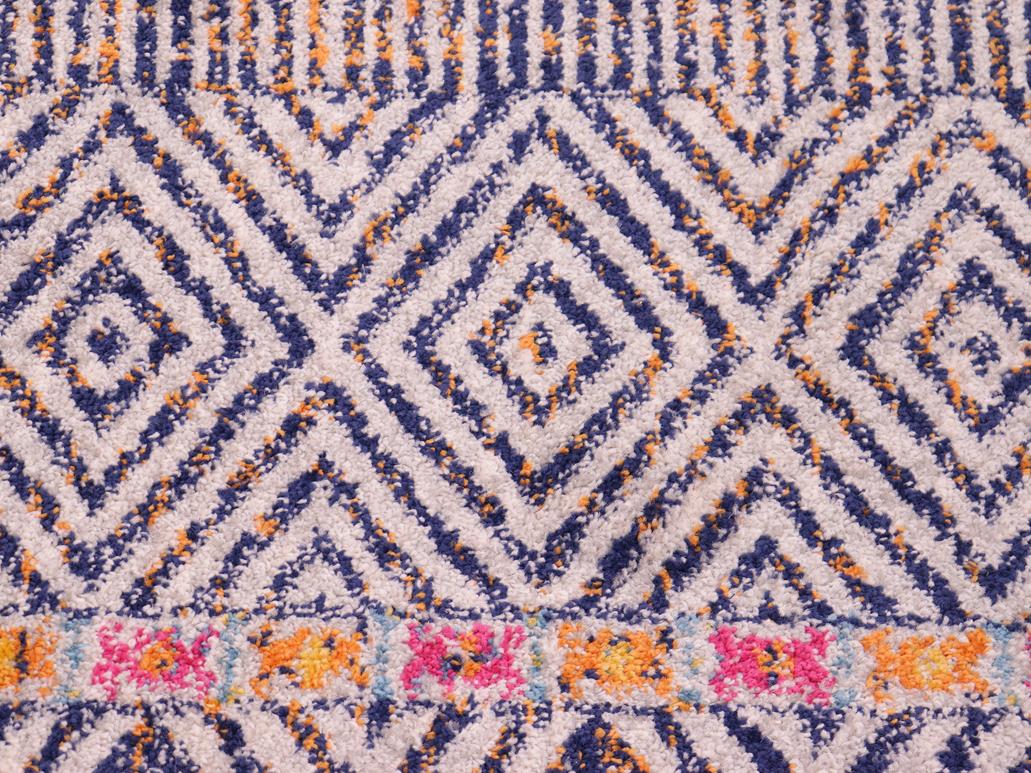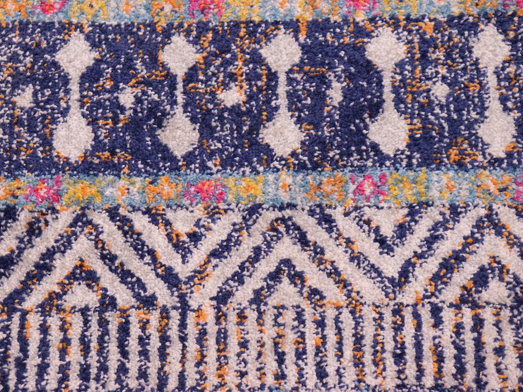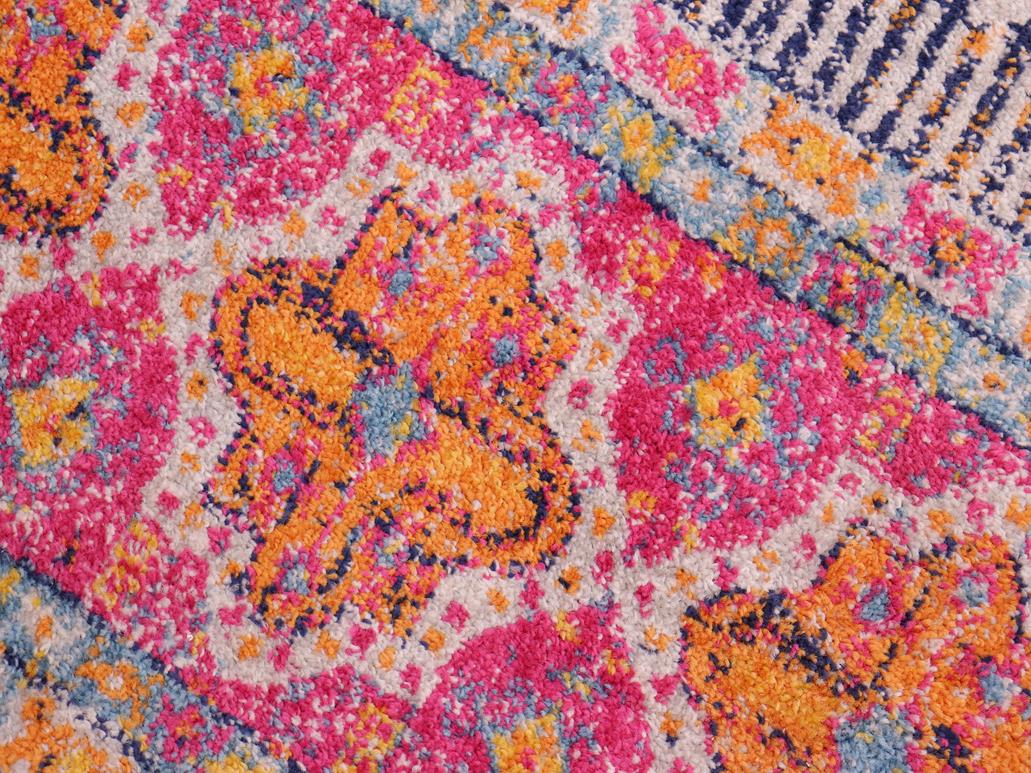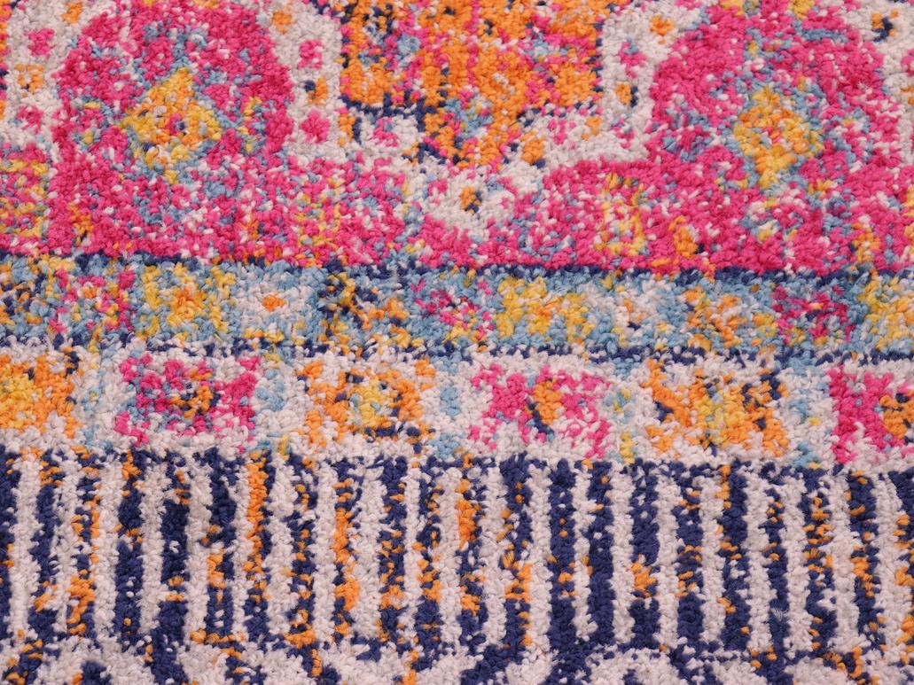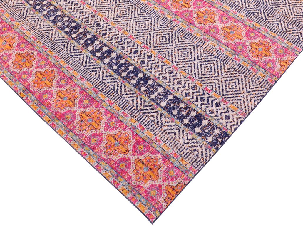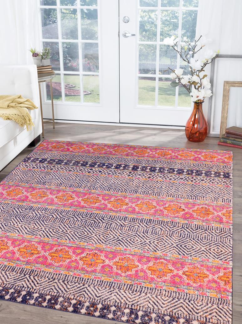 Add a splash of color to your decor with this stylish and exotic breathtaking tribal area rug. An ornamental bohemian rug with an intricate pattern and a vibrant color pallet of Blue, Fuchsia, Gray, Ivory and Gold is a great addition to any space. Soft luminous pile featuring a contemporary motif, with a geometric floral intricate design is a great addition to any space.