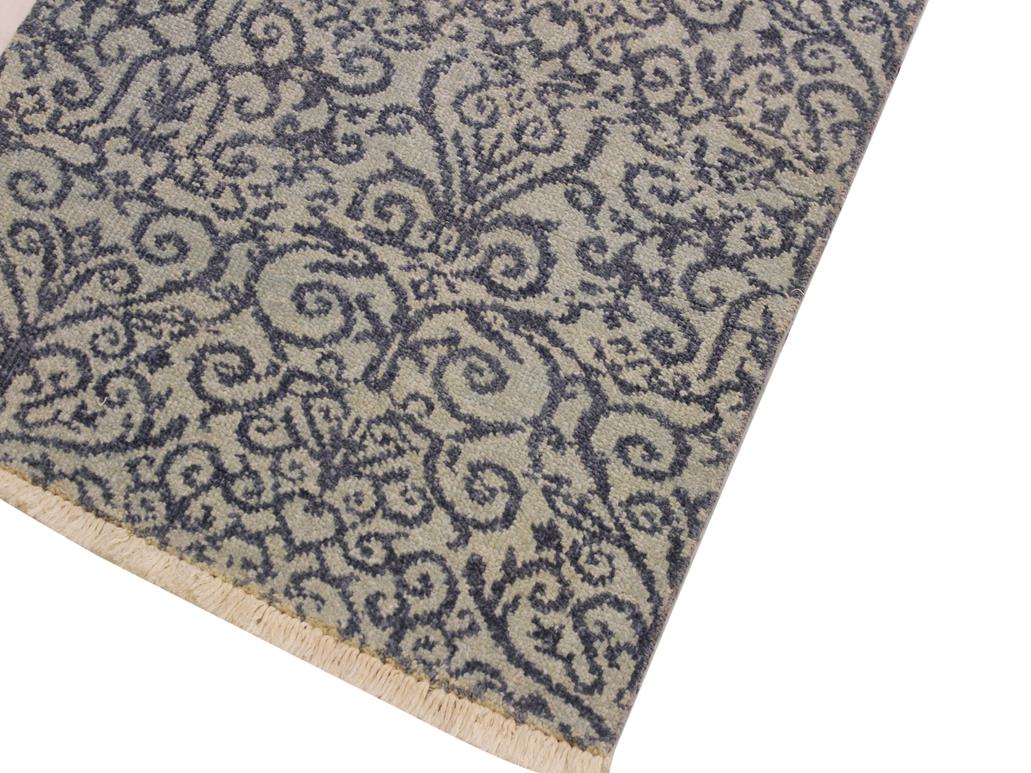 This elegant hand knotted rug features a modern fusion of beauty, with its interlocking geometric and minimalist pattern. This exclusive rug defies the ordinary by fusing art and design with detail and craftsmanship. A repeating intricate pattern of stylized interlocking diamond motif, with two toned colored pallets made with wool and viscous silk, this beautiful handmade rug adds a perfect finishing of elegance and luxurious feel to your decor.